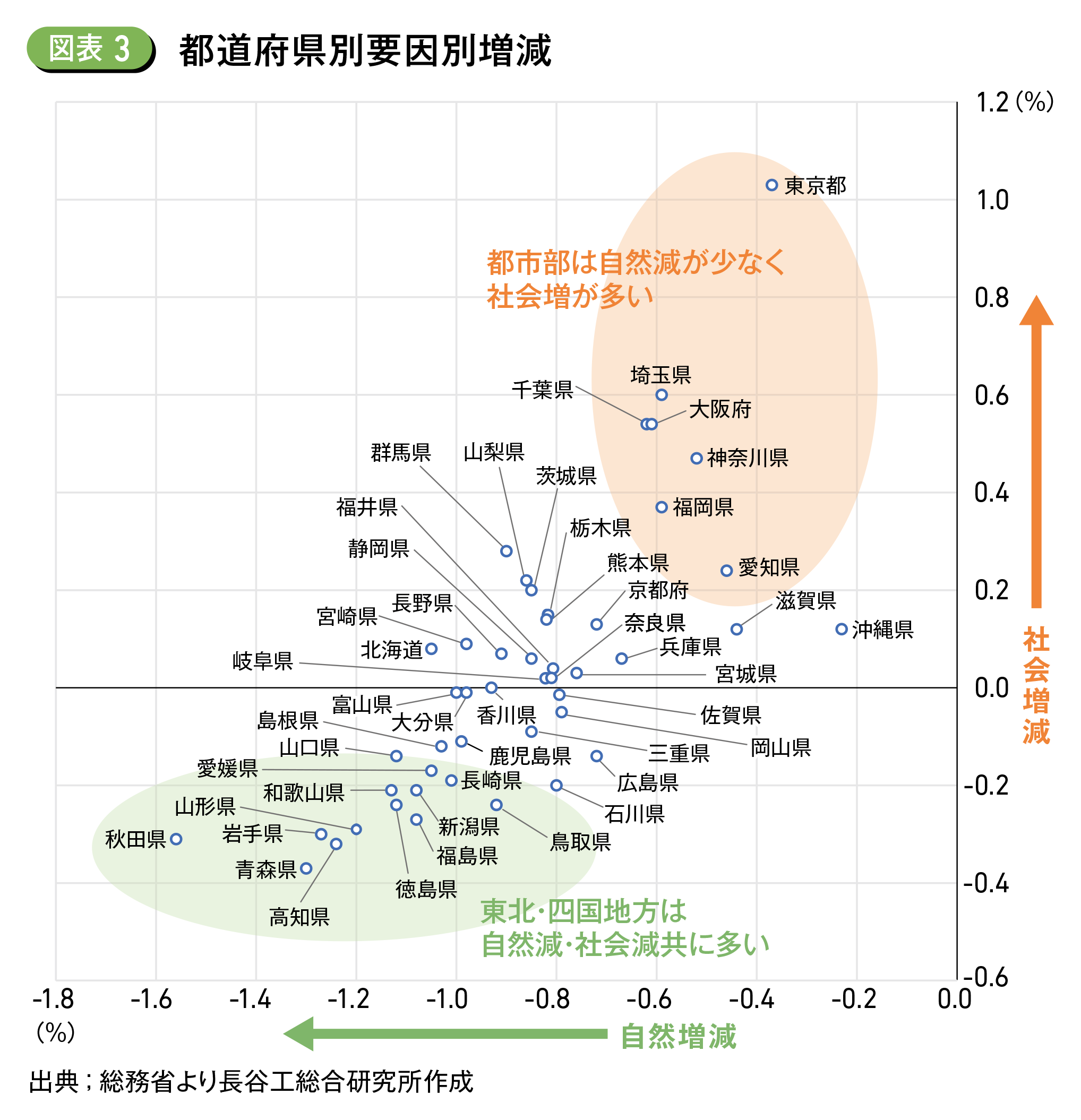 都市部においては「社会増加+緩やかな自然減少」であるのに対し、東北・四国地方を中心に、地方では「社会減少+自然減少」の進行が顕著である (図表3)。