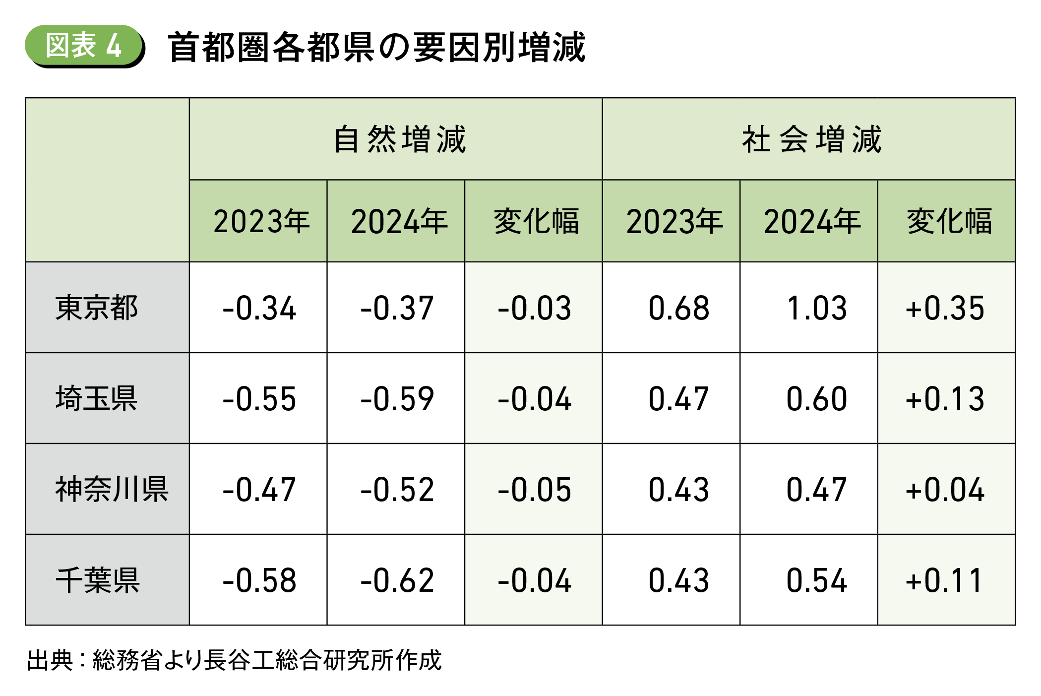 首都圏各都県の人口増減を要因別に見ると、いずれの都県も自然減少・社会増加の傾向が確認できるが、変化幅では埼玉県の社会増加が東京都に次いで大きい。東京都心部に通勤しやすい近郊地域での住宅供給の増加や都内の住宅価格の高騰の影響などが、自然減少を上回る社会増加に繋がった (図表4)。