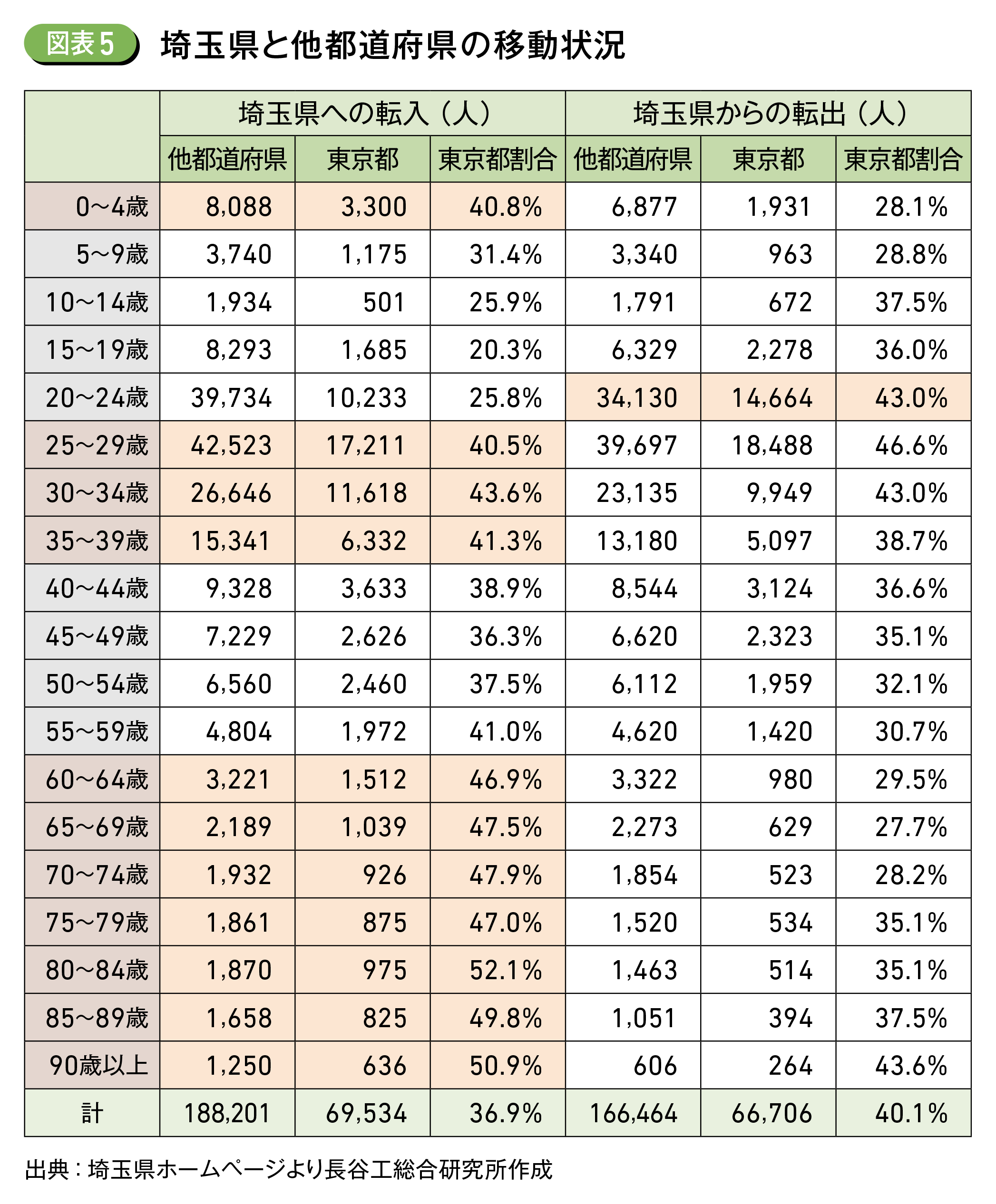 埼玉県の人口増加は主に東京都からの転入によるもので、25~34歳の結婚・持ち家取得・子育てなどのライフステージの変化を伴う世代と60歳以上でその傾向が顕著である。このように埼玉県の人口増加は、東京都との間での移動が大きな要因と考えられ、特に子育て世代や高齢者の転入が人口増加に寄与している。埼玉県は都内に比べて住宅価格が安いことから、持ち家を取得しようとする子育て世代の受け皿となっている一方で、通学・就業などにあたる20~24歳の若年層の40%程度が東京都へ転出しており、埼玉県と東京都間の年齢の違いによる人口移動の実態が確認できた (図表5)。