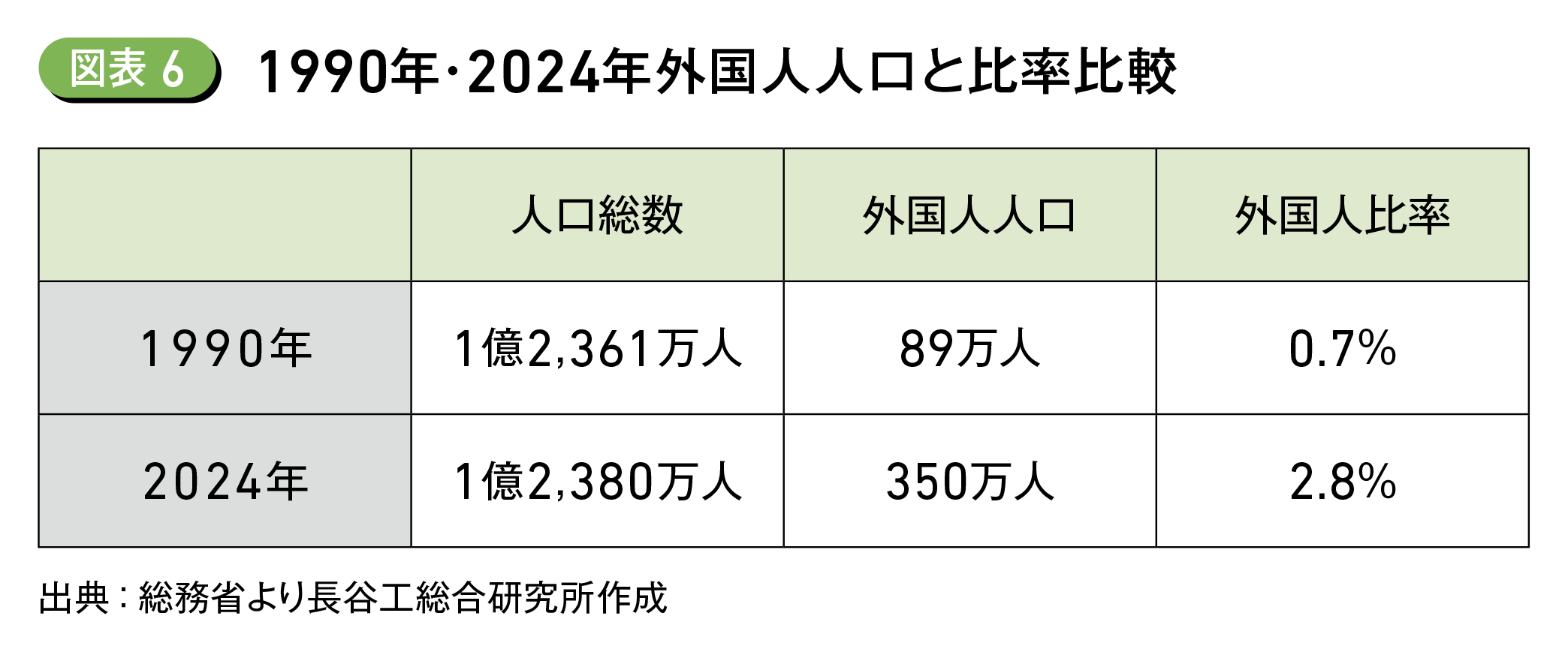 ※外国人の人口は2019年の287万人(総人口比2.3%)であったが、コロナ禍により2021年には270万人(総人口比2.1%)に減少した。その後、増加に転じ2023年には332万人(総人口比2.7%)まで増加。2024年は2023年を上回る人口となった(住民基本台帳より)。