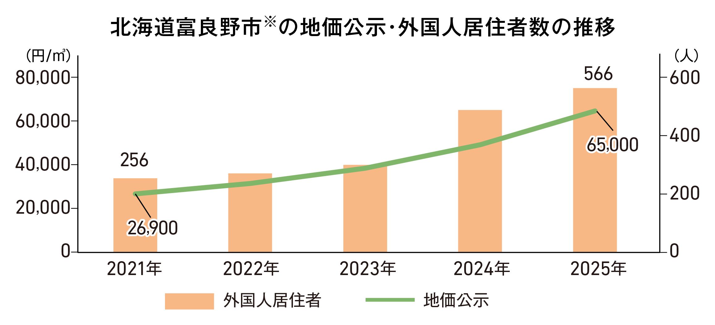北海道富良野市は国内外からの観光需要が高く、外国人居住者の増加が著しい。外国人居住者の人数は2021年比較で2.2倍に、地価公示は2.4倍と短期間で大きく伸びた。