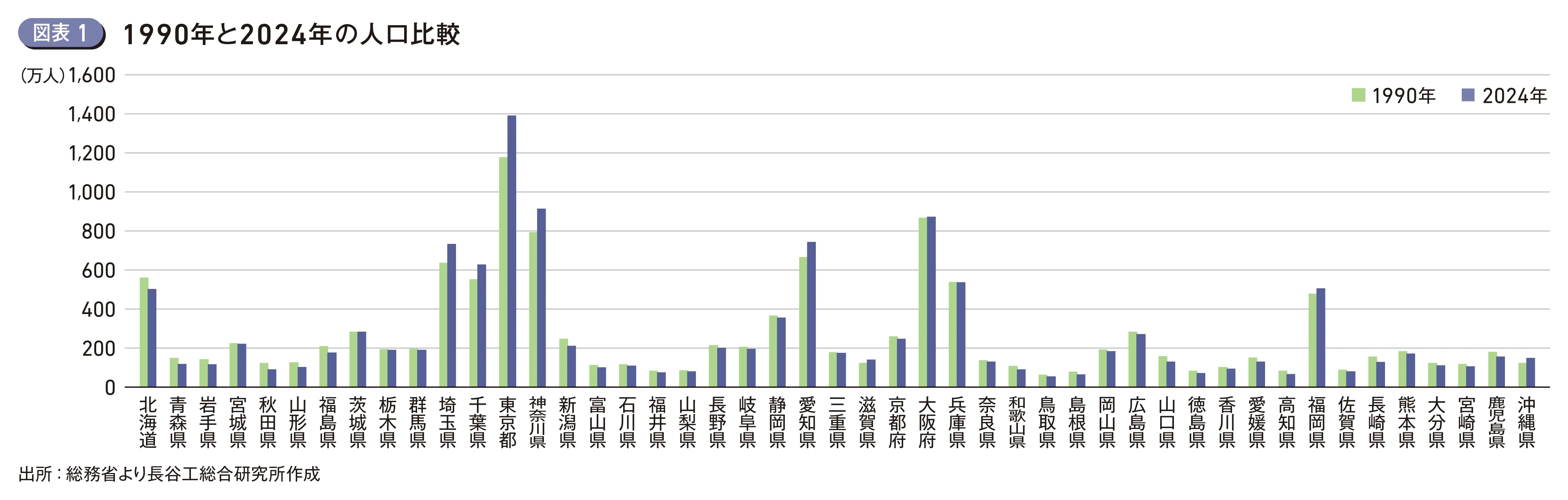 日本の人口分布は、1990年から2024年にかけて大きく変化した。特に顕著なのが首都圏への一極集中が加速した点である。(図表1)は1990年と2024年の都道府県ごとの総人口を示したものであるが、東京都は1990年でも2024年においても最も人口の多い行政であり、全国に占める人口比率は1990年の9.6%から2024年には11.5%と約2ポイント増加した。