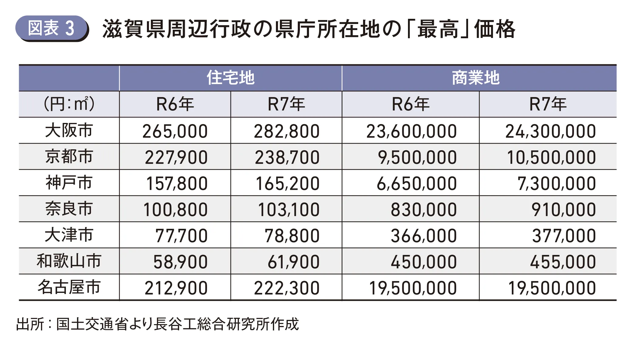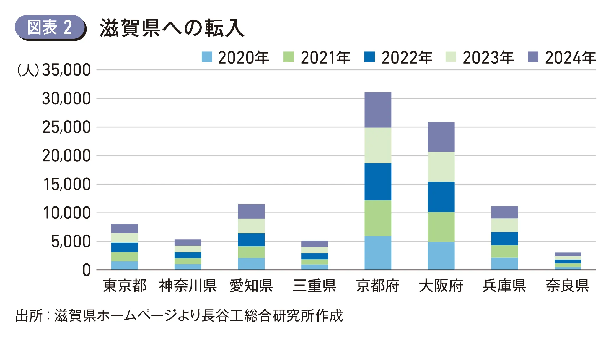 1990年時点で東京都に次ぐ人口を擁していた大阪府は、2024年には人口比率こそ7.1%を維持したものの、人口は神奈川県に抜かれ全国第3位となった。結果、首都圏の人口比率は25.8%から29.9%へ4ポイント増加し、人口集中が進んだが、近畿圏の人口比率は16.6%から16.2%と0.4ポイント減少した。近畿圏の中で唯一人口が増加したのは滋賀県で、122万人から140万人へと増加し、人口比率は1.0%から1.1%と微増した。滋賀県の人口増加の要因としては、近畿圏・中部圏・北陸圏のクロスポイントという地理的な優位性、主要各都市への交通アクセスの良さ、日本を代表する企業の工場や研究開発拠点が集積、地価が大阪府や京都府に比べ安価であることが挙げられる。こうした理由から、より安価でより良い住環境を求める若年世代を中心に移住が促進されているものと考える(図表2)(図表3)。