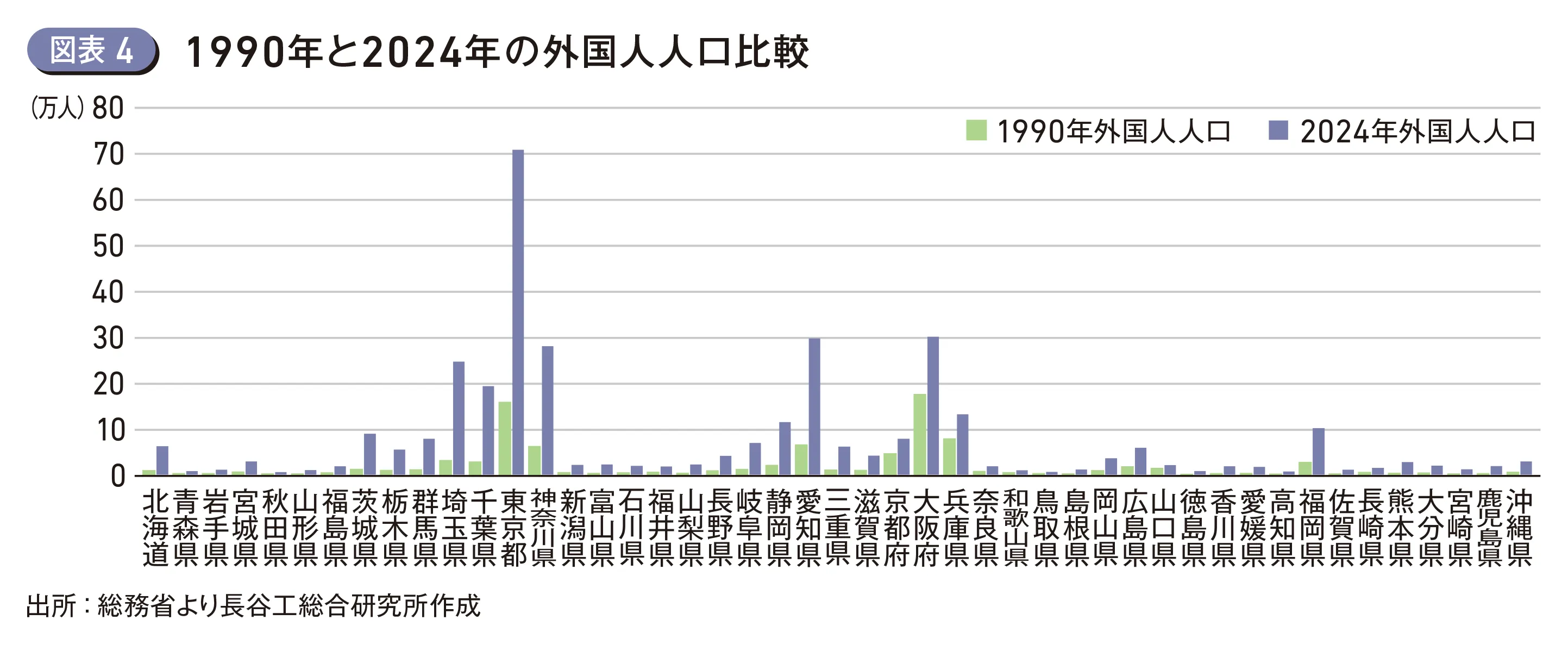 (図表4)は1990年と2024年の都道府県ごとの外国人人口を示したものであるが、1990年において外国人人口が最も多かったのは大阪府で全国に占める外国人人口比率は20%と、日本にいる外国人の5人に1人が大阪府在住であった。