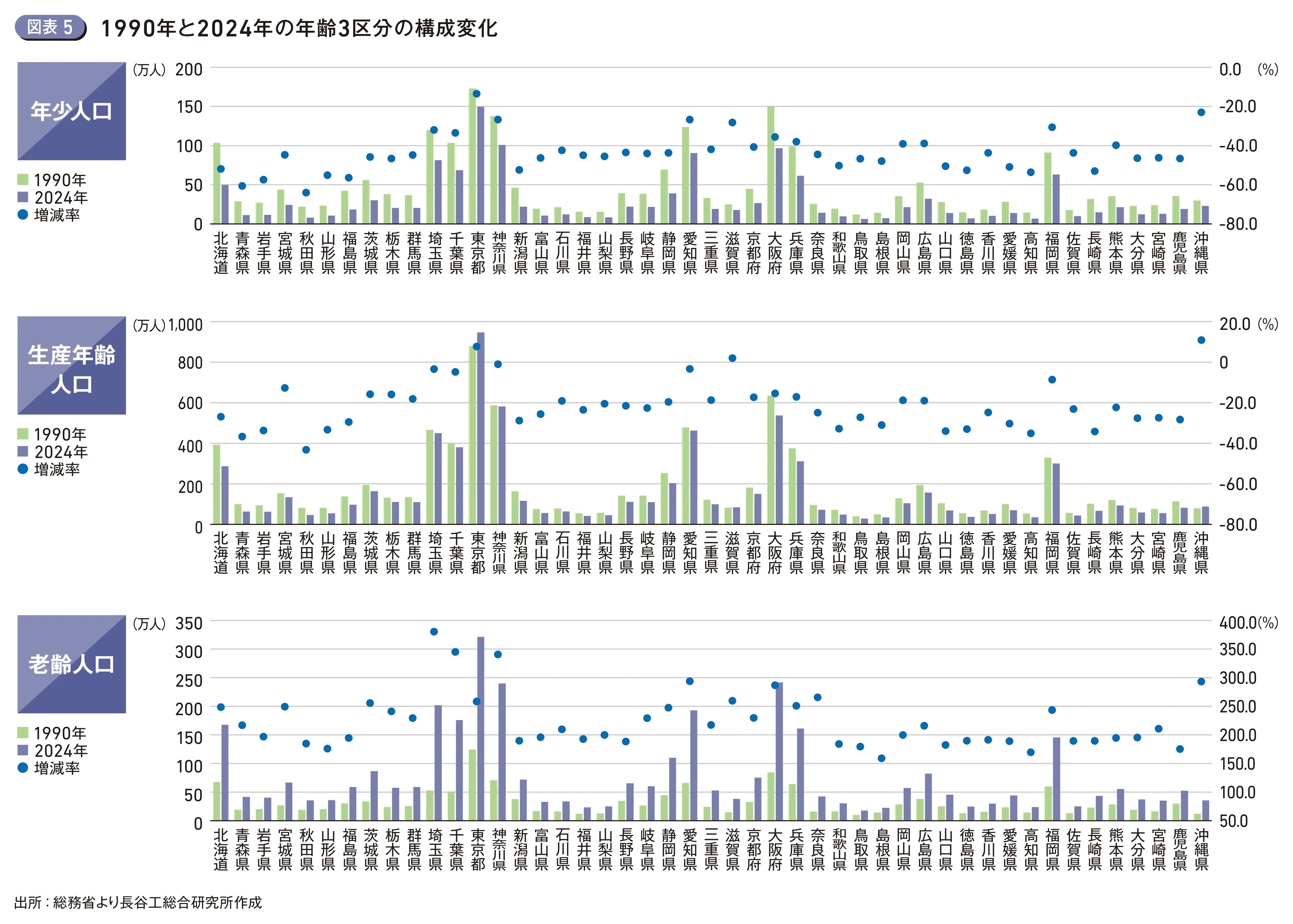 65歳以上の老齢人口は1,489万人から3,624万人へと2,135万人(約2.4倍)と大幅に増加した。全国の約半数の都道府県で2倍以上の増加を示しており、高齢化社会を象徴する結果となった。特に増加が顕著なのは埼玉県(3.8倍)、千葉県(3.5倍)、神奈川県(3.4倍)といった東京大都市圏であり、そのほか愛知県・沖縄県(2.9倍)、大阪府(2.8倍)などでも著しく増加した。大都市圏へ流入・就業した世代が、持ち家の取得によりそのまま住み続けて高齢化したことが主な要因と考えられるが、かつて経済社会の中核を成す多くの生産年齢世代を受け入れた都市部ほど、今や高齢者を多く抱える地域となっている(図表5)。