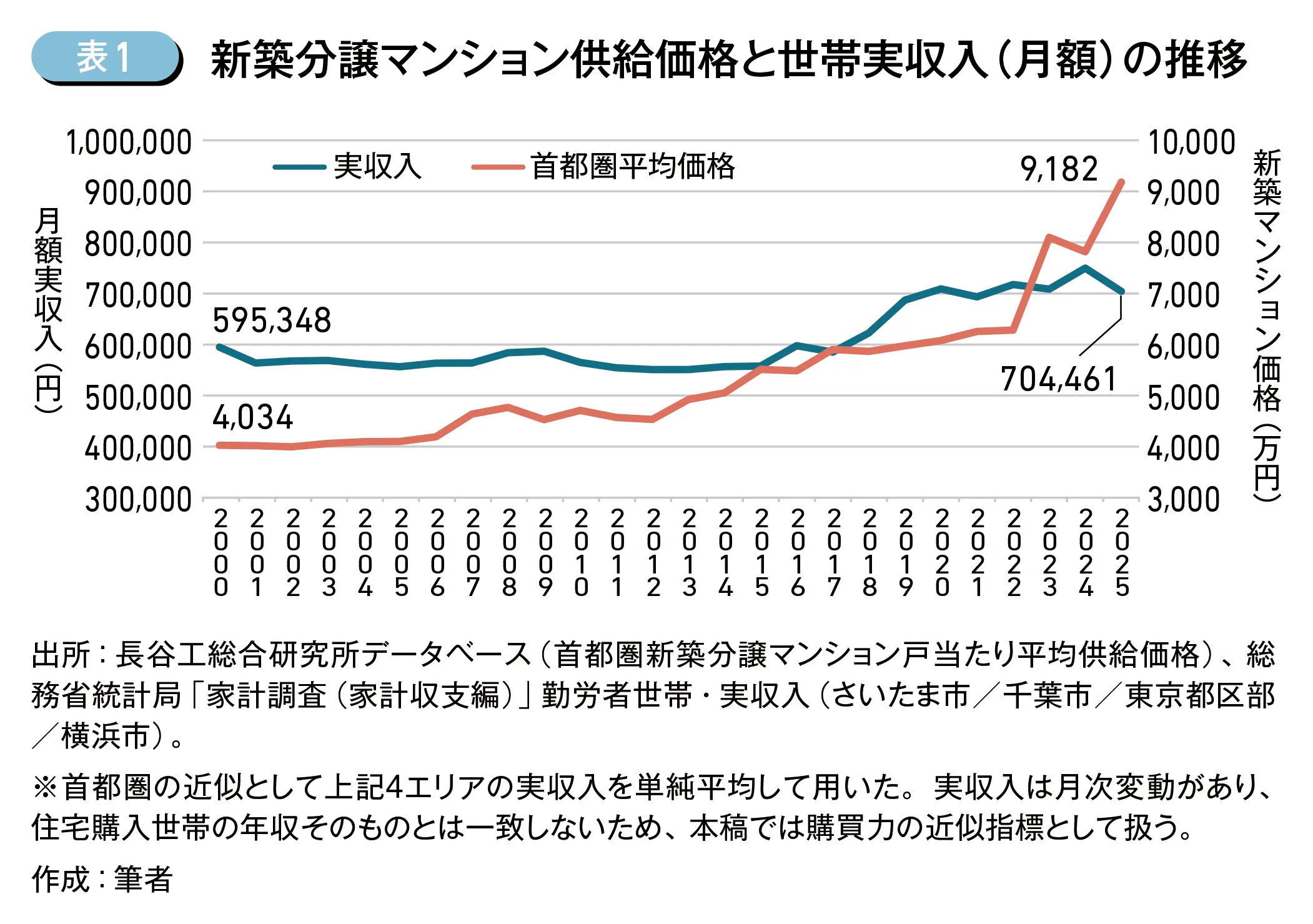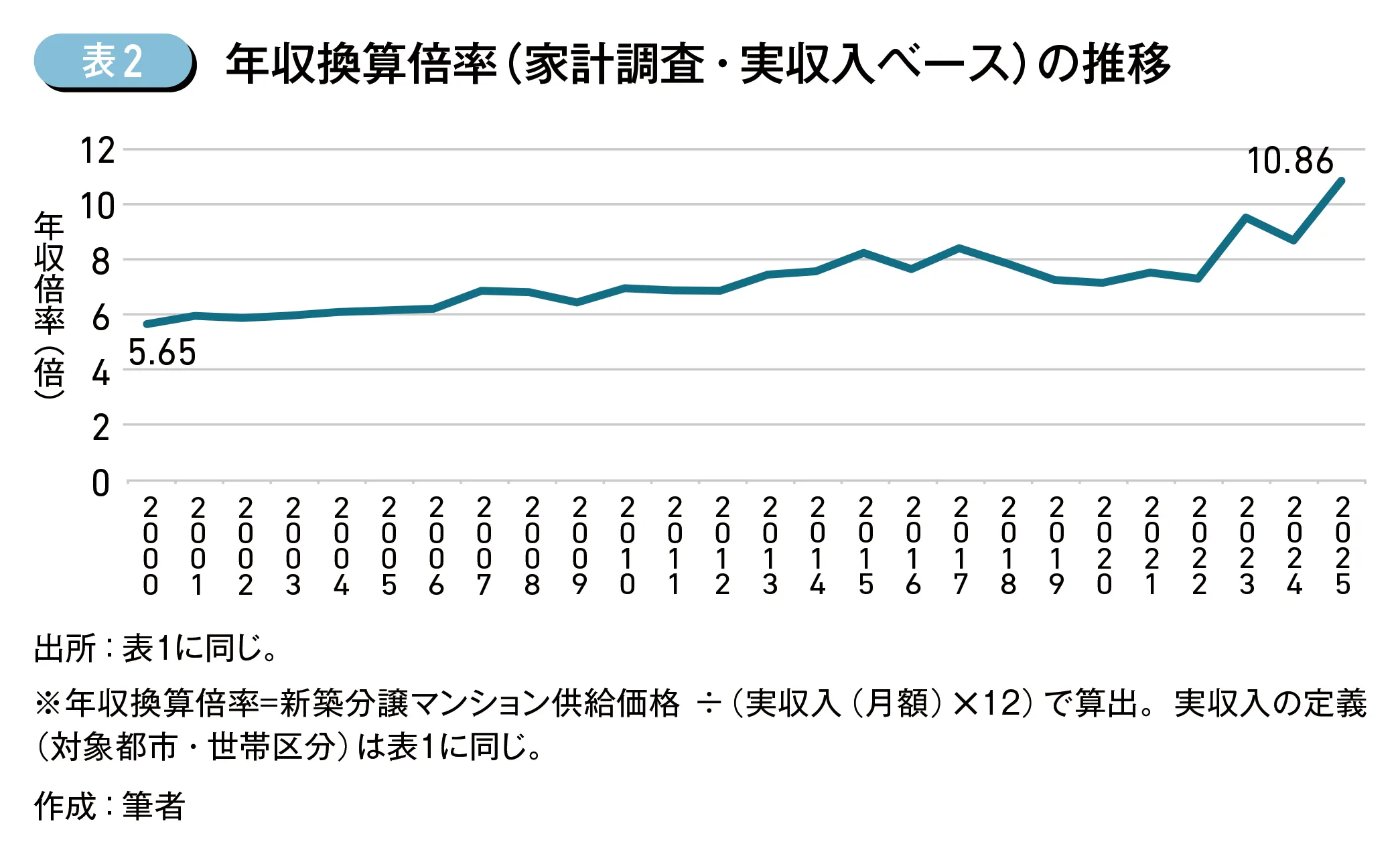 さらに(表2)に示す年収換算倍率(家計調査・実収入ベース)は、2025年時点で2000年比約1.9倍に上昇しており、住まいを「買う」という意思決定が平均所得層にとって一段と重くなっていることを示唆する。