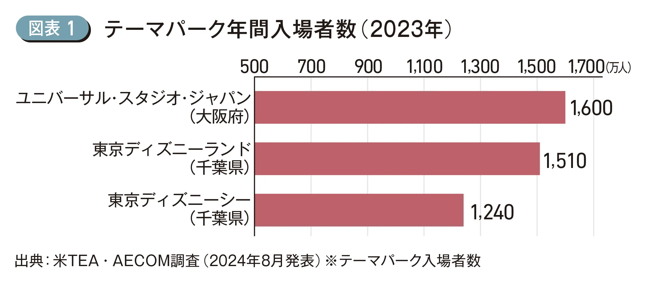 国内では「東京ディズニーランド」1,510万人、「東京ディズニーシー」1,240万人が多い。2つのテーマパークが隣接して棲み分けているのはアメリカのスタイルに習っている。