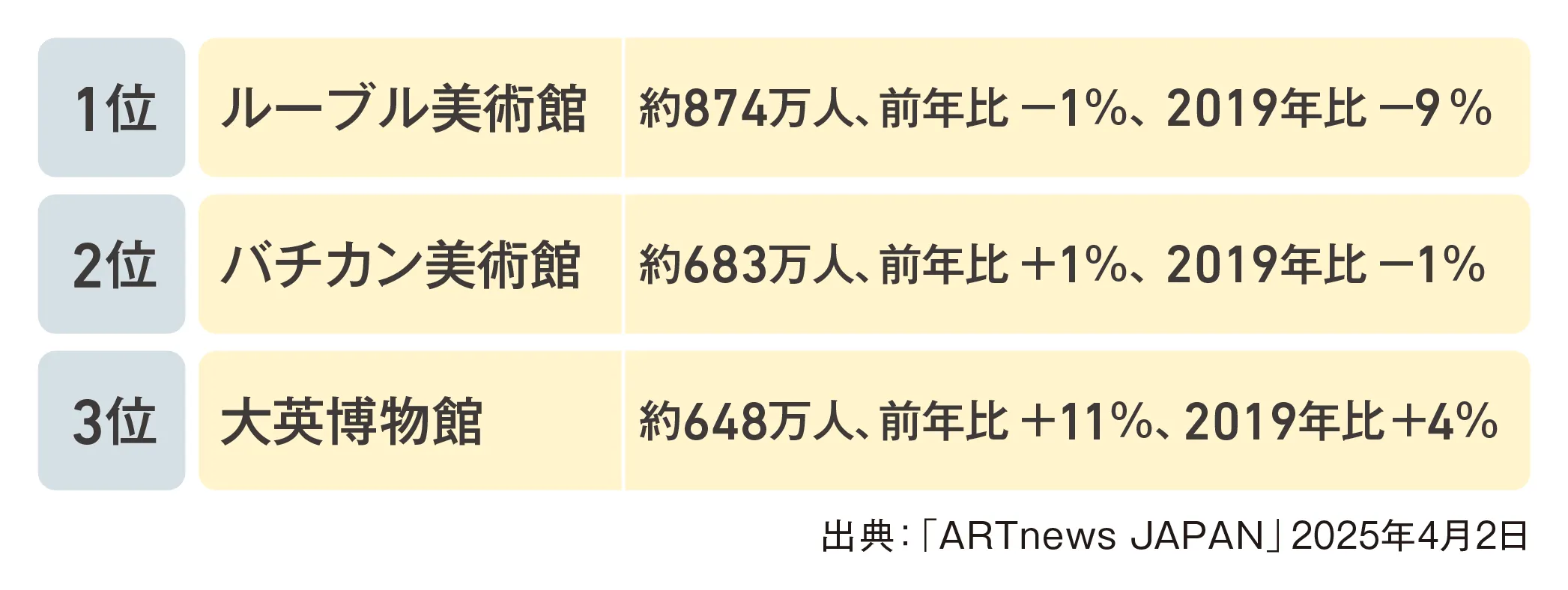 イギリスの美術館は1990年代後半から2000年代初頭にかけて、国や慈善団体からの資金が不足した中、ブランディングと商業活動によって資金を獲得し、美術館の資金調達モデルの先駆者となった。ロンドンの「ヴィクトリア・アンド・アルバート博物館」(年間352万人)は昨年、テイラー・スウィフトの展覧会「テイラー・スウィフト:ソングブック・トレイル」の開催によって前年比13%の伸びを示した。※出典: 「ARTnews JAPAN」2025年4月2日