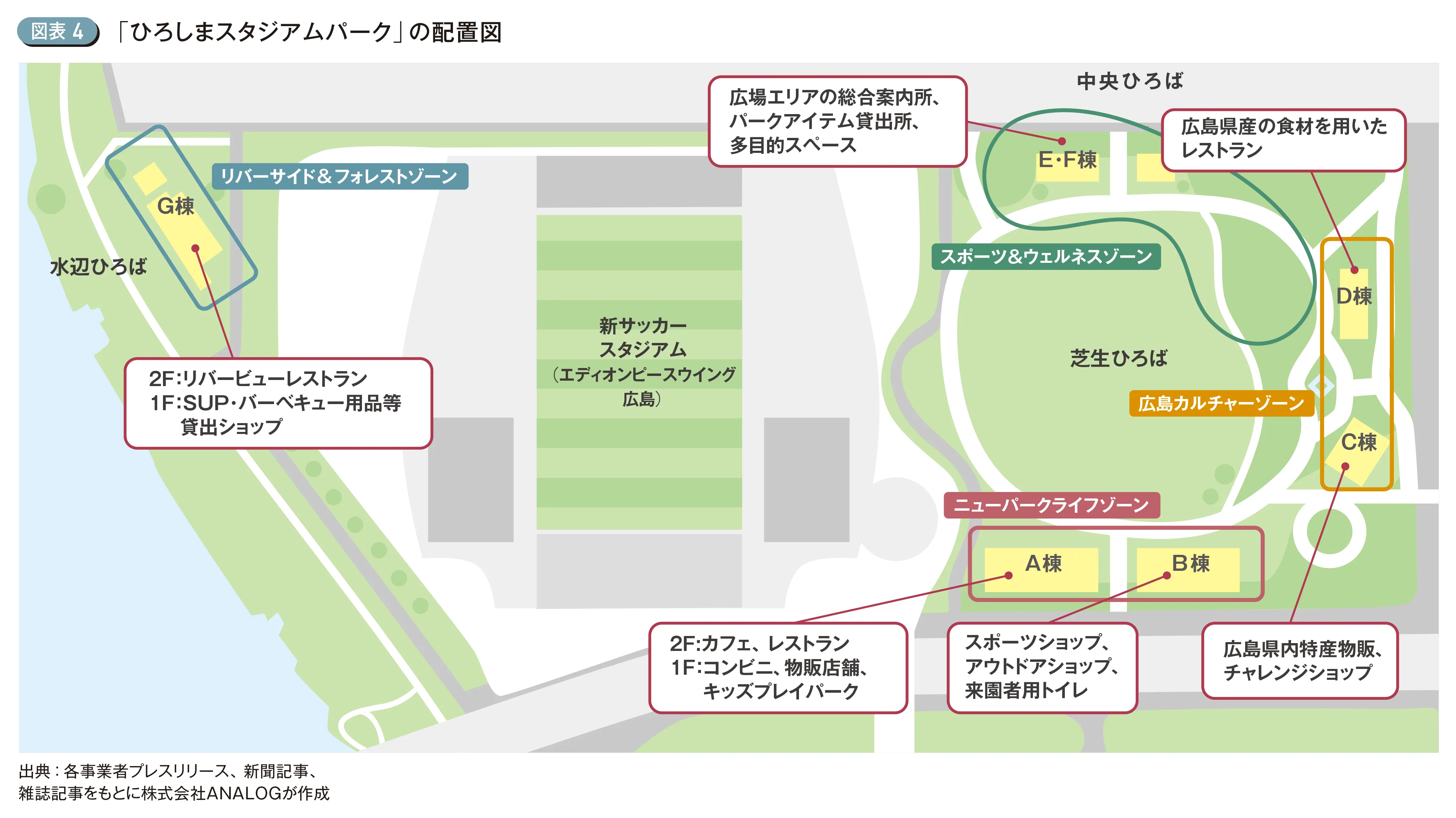 「ひろしまスタジアムパーク」は市内の施設として「広島城」「ひろしま美術館」「平和記念公園」に隣接し、エリア外からの観光客の周遊の核になっている。❶❷の事例が新しい都市の核の形成のための機能を集積しているのに対して、こちらは都市の回遊の拠点づくりが主目的に見える。発想が逆なのだろう。