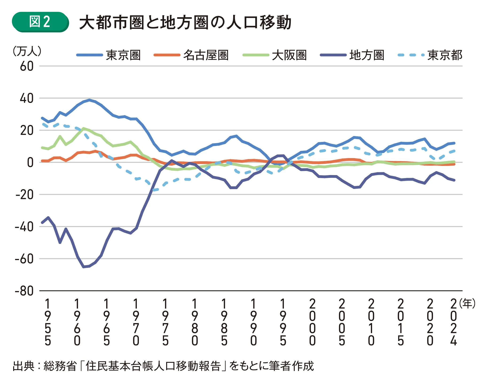 第1世代(2025年時点:70~99歳)は、前半が昭和ひとけた世代、焼け跡世代、後半が団塊世代、しらけ世代の一部を含み、価値観などは異なっているかもしれないが、きょうだい数が多く、婚姻率が高く、長寿命化を牽引し、大都市圏に大量に移動したという特徴がある。まさに、高度経済成長を支えた世代である。人口規模は第0世代の2倍近いボリュームがあり移動数も多いため、旺盛な住宅需要を生み出した。復興期から1970年代始めにかけての地方圏から都市圏への人口大移動は、まさに第1世代が仕事を求めて移動した結果である(図2)。