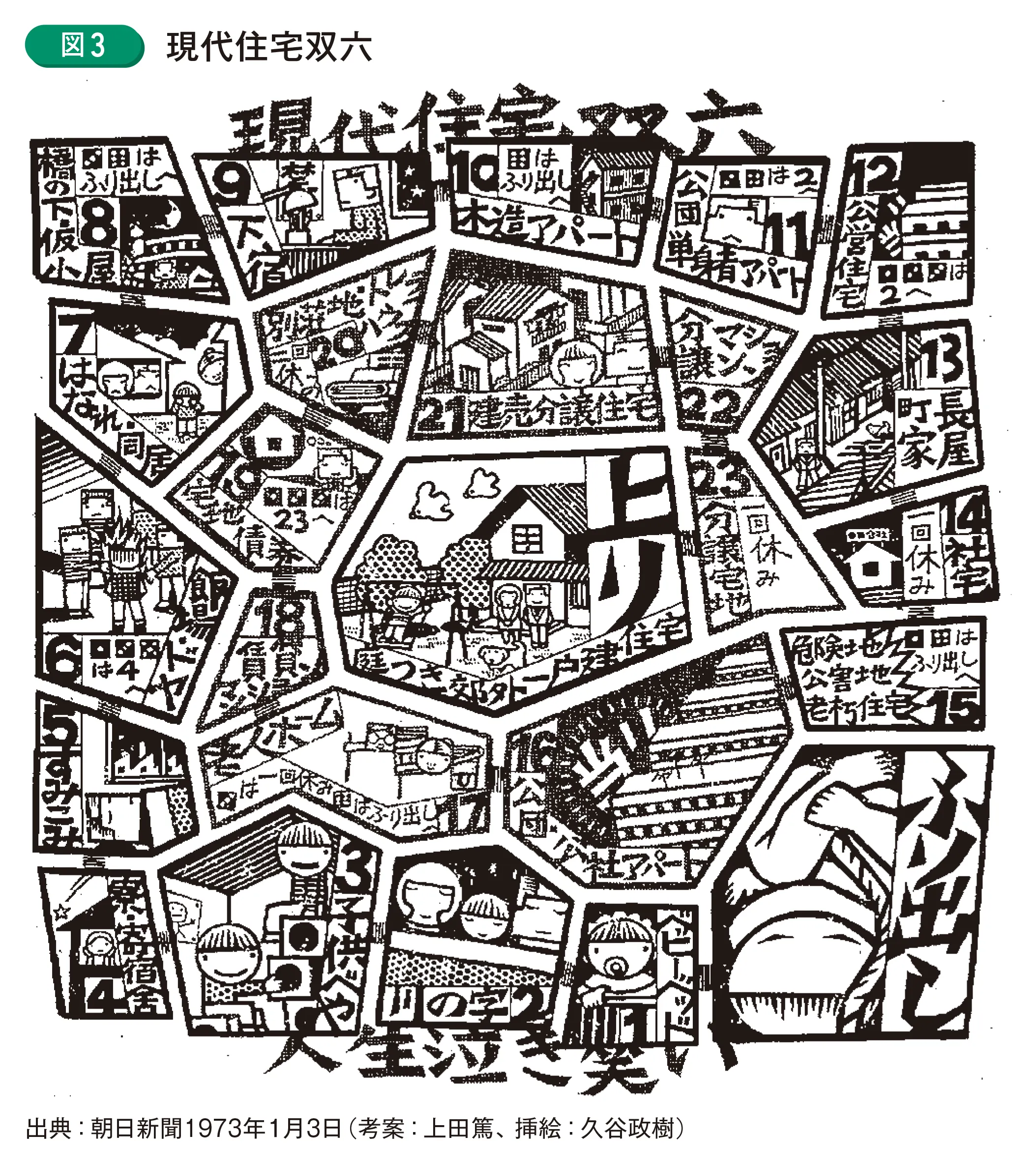 第1世代のライフコースを考えてみよう。3世代同居していた地方の実家から、就職や進学のため都市部に移動し、始めは住み込み、寮、間借り、トイレ共用・風呂なしの木賃アパートで暮らし始める。結婚を機に少し広めの社宅やアパートか運が良ければ公営や公団の賃貸住宅に引っ越しをする。その後、一国一城の主を目指して、農地を安く手に入れて退職金で家を建てる場合もあれば、ローンを組んで郊外のミニ戸建や分譲マンションを購入する場合もある。物価が高騰し、土地価格も上昇していたので、早い時期に組んだローンの支払い負担は相対的に軽くなり、転売してより広い住宅に住み替えることができた人もいる。子ども2人を持ち、夫は都心に通勤して妻は専業主婦という核家族の標準世帯が大都市郊外に数多く誕生した。都市部に移り住んだ第1世代のライフコースとその本音とを見事に表現したのが、1973年正月に新聞に掲載された「現代住宅双六」である(図3)。