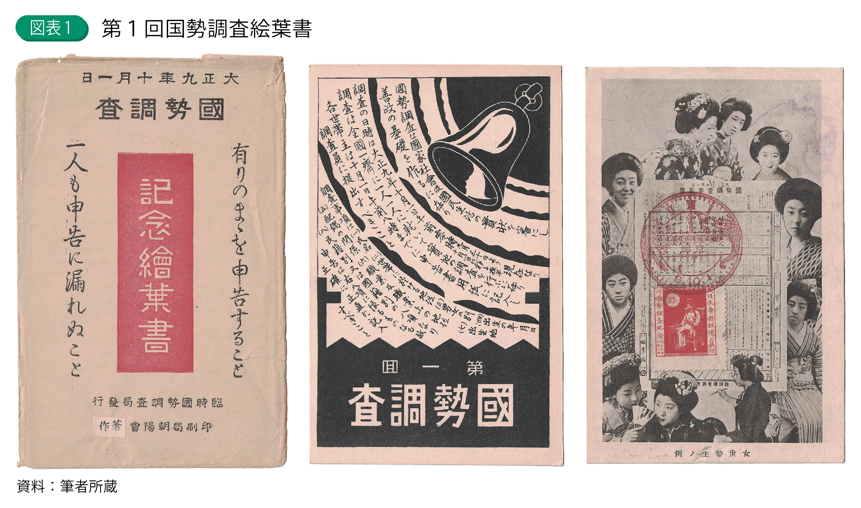 国勢調査は、全国民が対象となる一大行事であり、大正時代に調査を成功させることは「一等国の仲間入り」を示すことでもあった。そこで、国勢調査を広く知らしめるために唱歌や様々な記念絵葉書などがつくられた。臨時国勢調査局発行の絵葉書には、「国勢調査は国家社会及国民生活の実情を審にし善政の基礎を作るに在り」と書かれ、調査日時や調査項目などが記されている。また、「有りのままを申告すること」が重要なメッセージであり、その真意は京都写真師組合発行の絵葉書「女世帯主の例」の裏面に「国勢調査は事実有りのまゝを調べるのであるから、入籍せないでも妻は妻、内縁でも夫婦は夫婦、私生子といはれて居つても長男次男といふ様に記入するのであります。」と印刷されていることからもうかがえる。戸籍上の家を調査するのではなく、あくまで世帯の実態を調査するという意図を国民に周知する必要があった。(図表1)