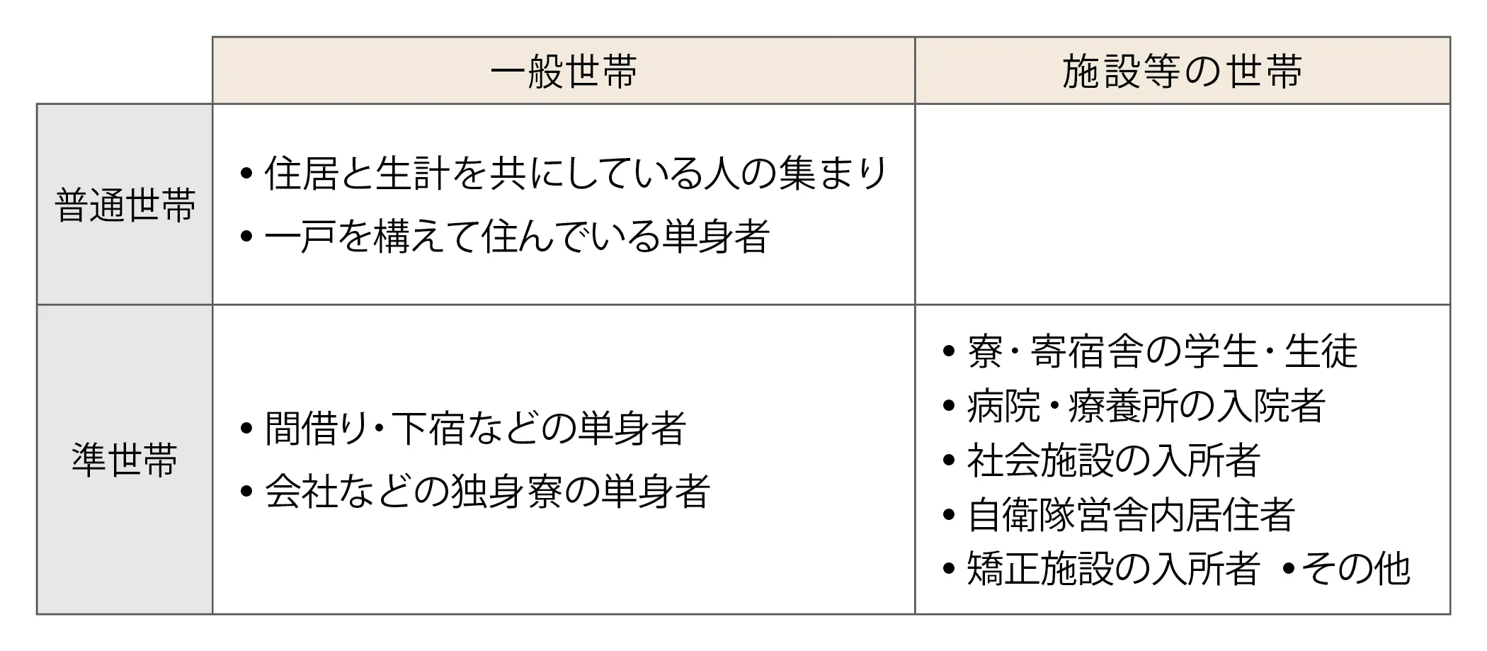 国勢調査における世帯の区分は、1920(大正9)年から1980(昭和55)年までは、住居と生計を共にする普通世帯と下宿・寮・施設などの準世帯に分けて把握している。基本的な考え方は現在も同じであるが、下宿などの単身者と会社の寮の単身者は、1985(昭和60)年以降は普通世帯と合わせて一般世帯として集計している。