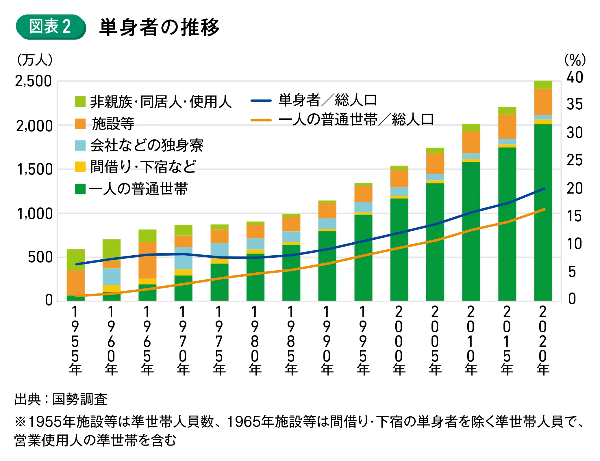 1955(昭和30)年以降の単身者の推移についてみると、その数が急増していることが一目でわかる。(図表2)