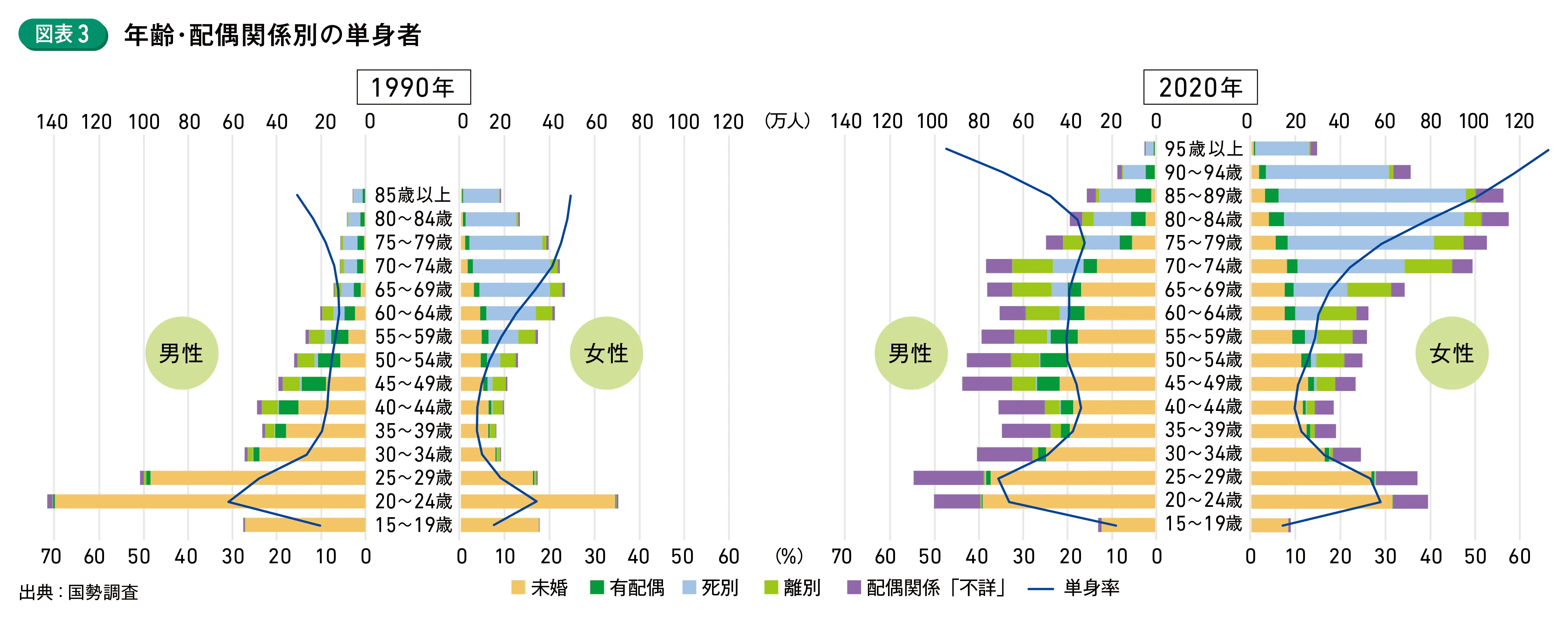 数が倍増した1990年と2020年の単身者(ここでは、一人の普通世帯と準世帯の合計)を、年齢と配偶関係から比べてみたい。(図表3)