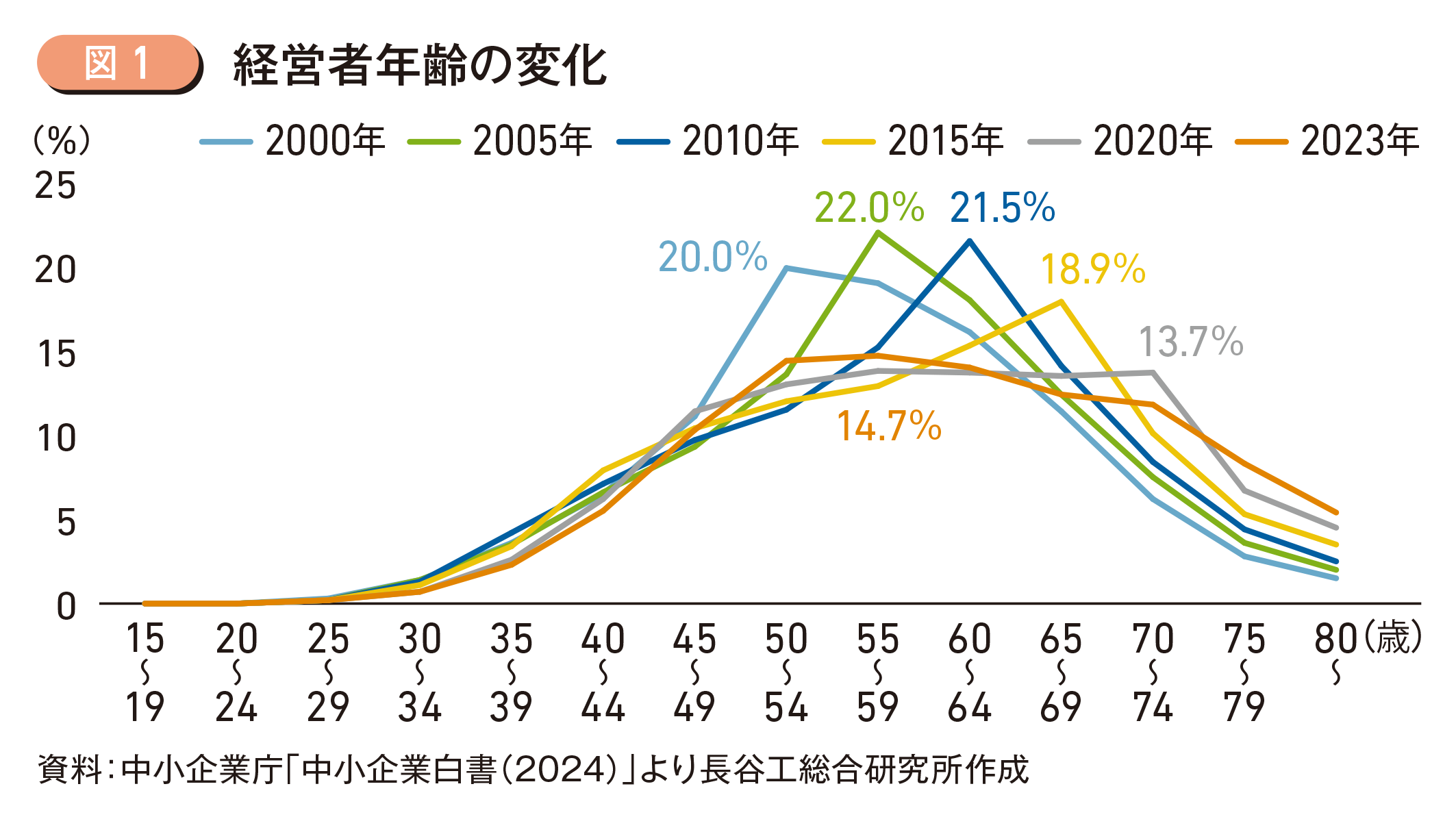 中小企業経営者の高齢化が進行しており、経営者年齢のピークはこの20年間で50代から60~70代へと大きく上昇している。平均年齢は60.5歳であり、過去最高を更新した(2023年現在)。経営者年齢が70歳以上である企業の割合は、2000年以降最高となっており、事業承継が必要となる企業は相当数存在している(図1)。