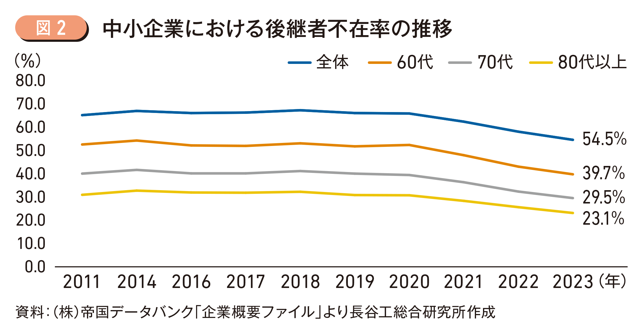 経営者の高齢化により次世代へのバトンタッチが求められているが、後継者不在率は2018年以降改善しているものの、2023年時点でも依然として高い水準であり、54.5%が後継者不在となっている(図2)。