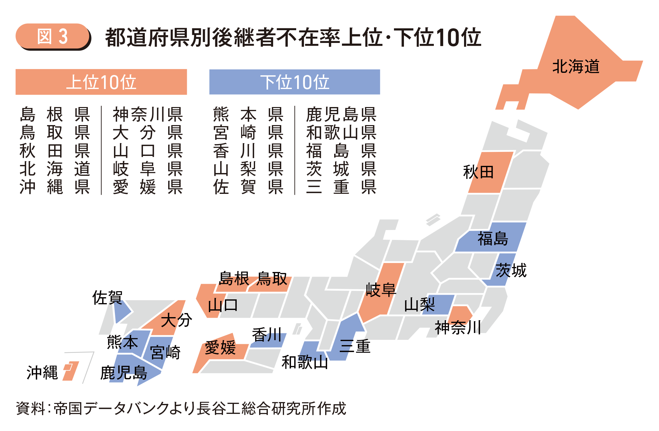 都道府県別後継者不在率が最も高いのは島根県で、全国平均を大幅に上回る75.1%。次いで高いのは鳥取県の71.5%だったほか、山口県も65.3%で山陰地方の不在率の高さが目立った。一方で不在率が低いのは三重県の29.4%で、地域金融機関が密着して事業承継の支援を行っていることや、比較的安定した経営や商圏を持っている企業が多く、親族が経営を継ぎやすい環境が整っているほか、事業承継支援ネットワークが構築されていることがその要因とされている(図3)。