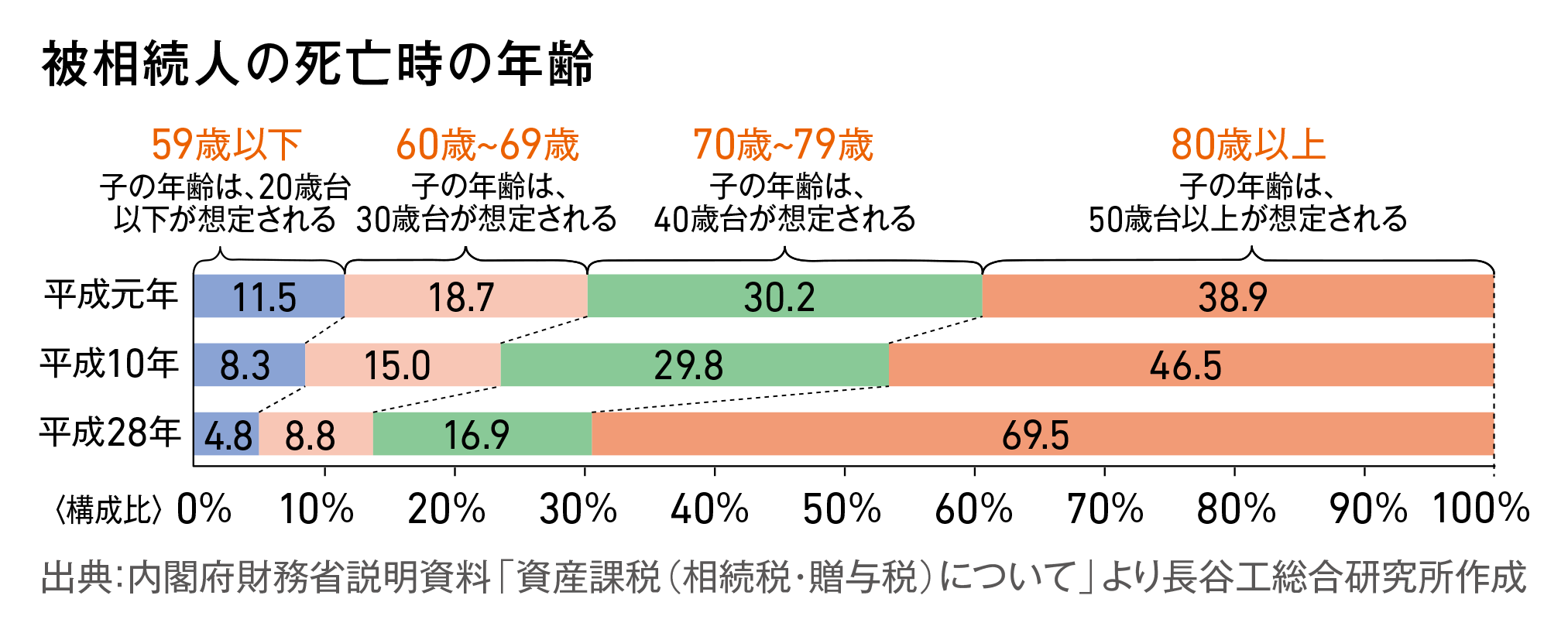 被相続人の高齢化が進んでおり、相続による若年世代への資産移転が進みにくい状況となっている。平成元年(1989年)には80歳以上の高齢者が被相続人となった相続は約39%であったが、平成28年(2016年)には約70%にまで増加した。被相続人の高齢化に伴い、相続人の年齢も50歳台以上が想定される比率が増加し、相続する側もされる側も高齢者の「老々相続」は今や日本の一般的な相続となった。また、被相続人が高齢である場合、殆どが配偶者も高齢であることから、次の二次相続が発生する時期が早いと考えている。二次相続の場合は、一次相続よりも法定相続人の数が少なくなり、また配偶者に対して与えられていた様々な税制優遇が適用できなくなるため、手続きがより複雑化するだけでなく、相続税が一次相続の時より高くなる可能性がある。高齢化比率の高い地方だけでなく、高齢者人口の多い都市部においても「老々相続」は増加が見込まれ、今後も注視が必要である。