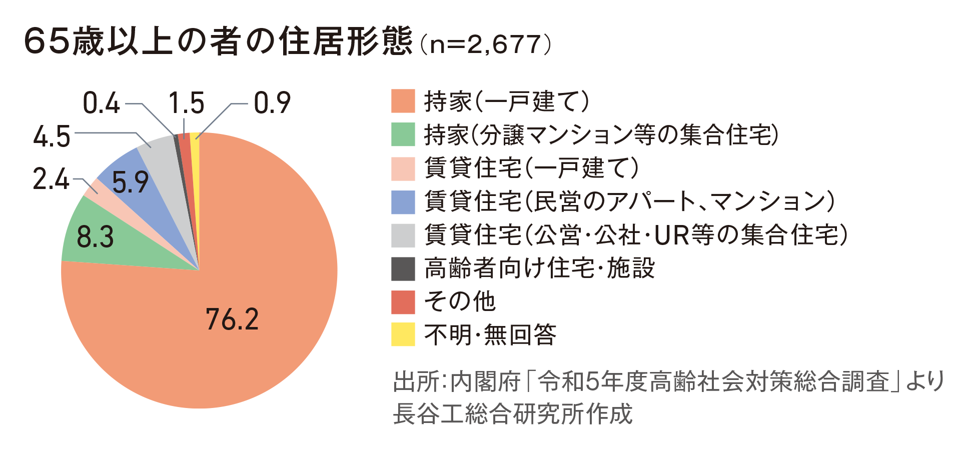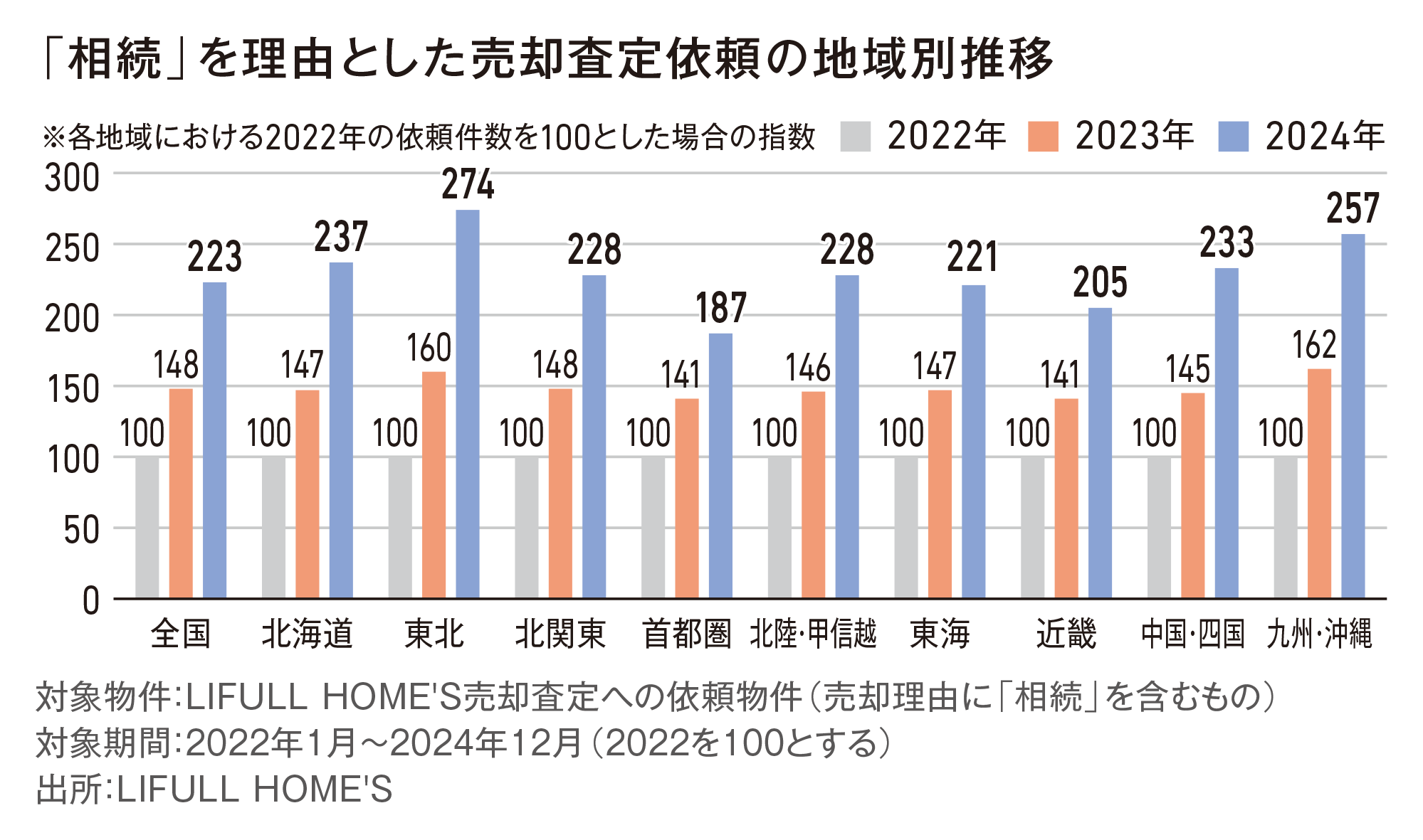 LIFULL HOME’Sの調査によれば「相続」を理由とした売却査定への依頼が増加している。3年間で「相続」を理由とした売却査定依頼の件数(2022年の件数を100とした場合)は、全国で2.23倍であるが、東北2.74倍、九州・沖縄2.57倍、北海道2.37倍となっている。65歳以上の8割以上が持家に居住していることや、今後高齢者の単身世帯の増加が見込まれることから、「相続」を理由としない売却の増加も想定される。ライフスタイルの変化を見込んだ早期の「家じまい」の検討が「空き家」「ゴミ屋敷」の発生を防ぐ一つの解決策になってくるだろう。