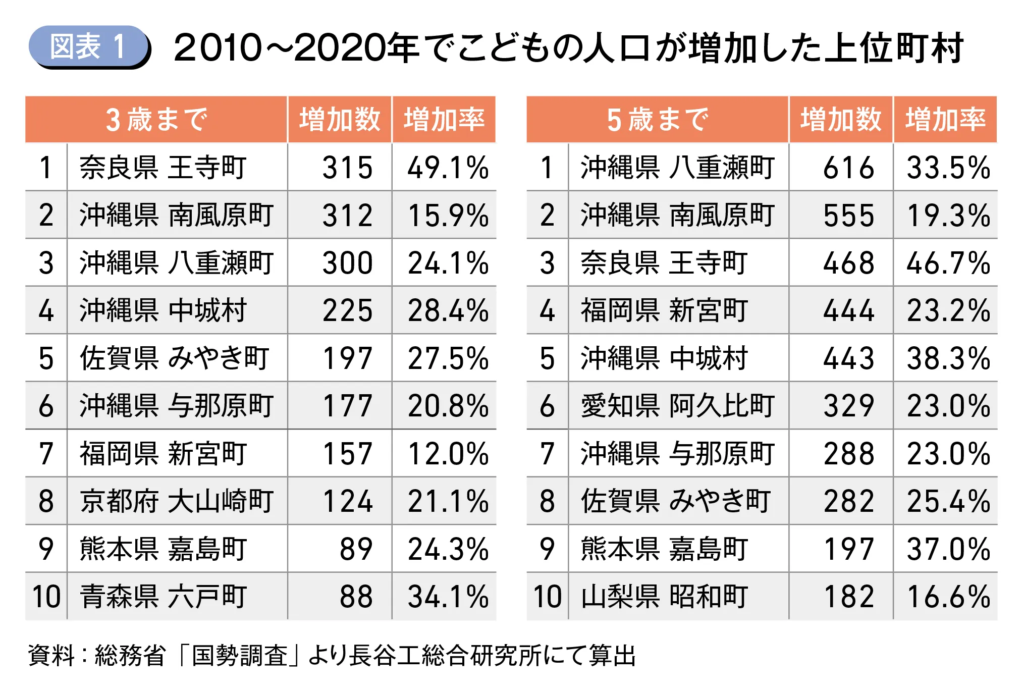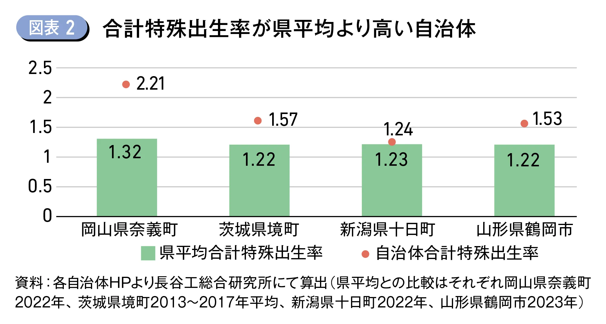 2010年と2020年で3歳まで、5歳までの人口を比較したところ、全国926町村の内、10年で3歳までの人口が増えたのは73町村(7.9%)、5歳までの人口が増えたのは92町村(9.9%)にとどまった。また合計特殊出生率が県平均より高かったのは、いずれも地方の自治体であり、地方の健闘が確認できた(図表1)(図表2)。