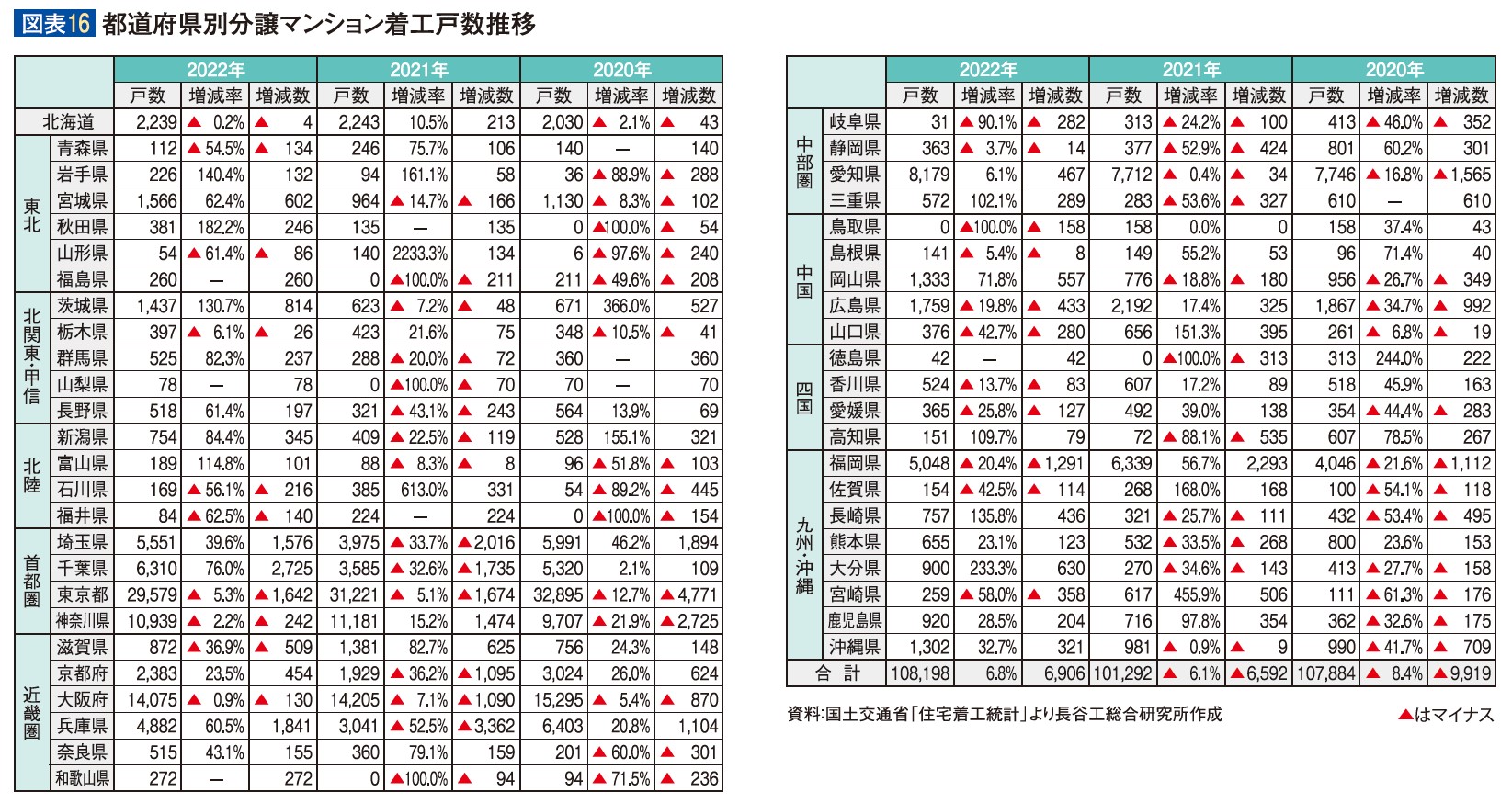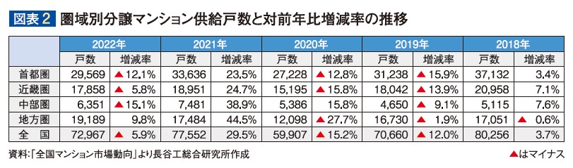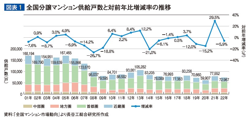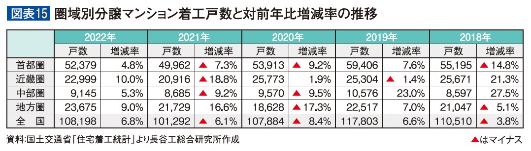前年比では減少したものの、新型コロナウイルス感染症拡大前の2019年(7万660戸)を上回る水準で推移した。また2022年の住宅着工統計によると、全国における分譲マンション着工戸数は前年比6.8%増の10万8,198戸で3年ぶりに前年を上回った。