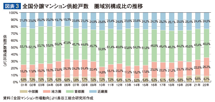 供給戸数について、圏域別構成比の推移をみると、首都圏は前年比2.9ポイントダウンの40.5%、近畿圏は同0.1ポイントアップの24.5%だった。中部圏は同0.9ポイントダウンの8.7%だが、新型コロナウイルス感染症拡大前の2019年(6.6%)と比較すると高い水準にある。三大都市圏を除く地方圏では供給戸数の増加もあって、構成比は同3.8ポイントアップの26.3%となり、2006年以来の25%を超える構成比となった(図表3)。