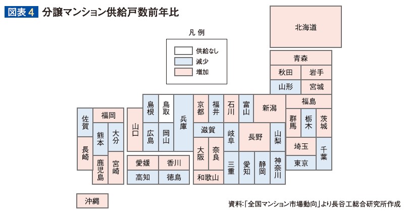 北海道は前年より507戸増の2,136戸の供給で、2008年以来の2,000戸台の供給となった。東北では山形県以外で前年増となり、宮城県で同626戸増の1,628戸、青森県では同293戸増の350戸が供給され、前年を大幅に上回った。