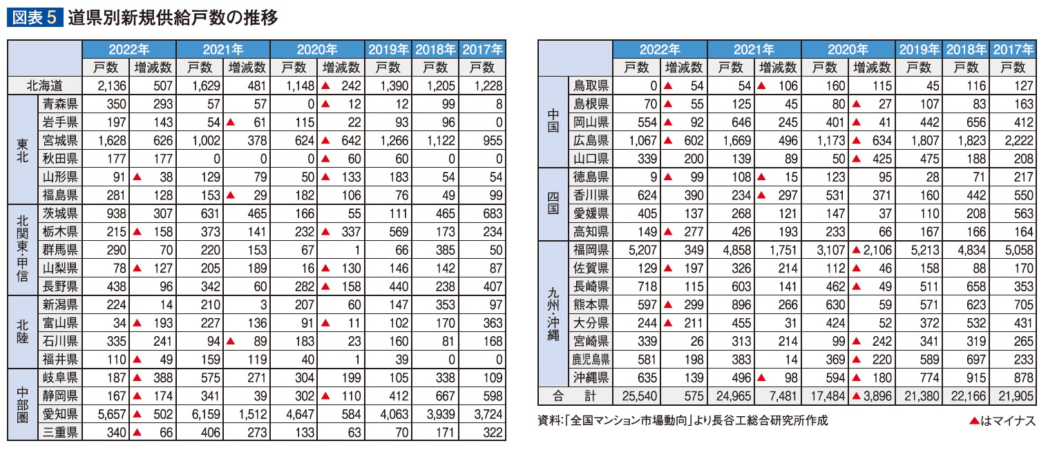 中部圏と地方圏の1道36県における新規供給戸数をみると、2022年は鳥取県を除く道県で供給が行われ、19道県では前年の供給を上回った(図表4)。