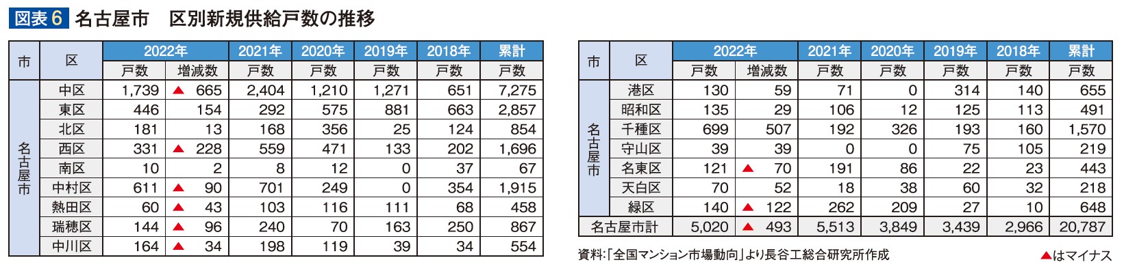 前年より493戸減の5,020戸。前年の供給戸数を下回ったものの、2年連続で5,000戸台の供給となり、2022年に供給が行われた市町の中では最も供給戸数が多かった。市内16区のうち前年を上回ったのは8区で、中でも千種区は前年より507戸増の699戸と増加。その一方で、前年に2,404戸と供給戸数の多かった中区では665戸減の1,739戸にとどまった(図表6)。