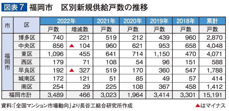 前年より466戸増の3,489戸。2020年を除くと2016年から3,000戸台の供給が続いている。区別では中央区で前年より104戸減の856戸、早良区で327戸減の192戸と減少。一方、東区は大規模物件の供給などもあり、455戸増の1,096戸と大幅に増加した。博多区・西区・城南区・南区でも前年を上回る戸数が供給されたこともあり、福岡市全体の供給増につながった(図表7)。