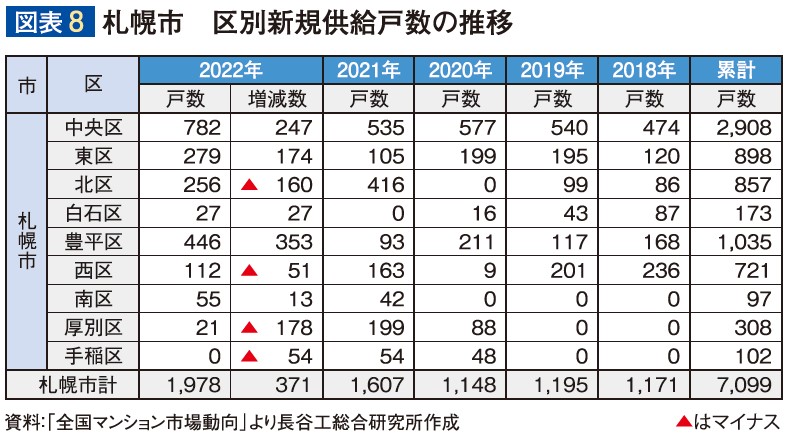 前年より371戸増の1,978戸。2,000戸前後の供給が行われたのは2008年(2,209戸)以来。豊平区では新規発売開始物件が多かったこともあり、前年より353戸増の446戸と増加した。豊平区以外では、中央区で247戸増の782戸、東区で174戸増の279戸と前年を上回ったことで、北区で160戸減の256戸、厚別区で178戸減の21戸と前年を下回り、手稲区と清田区では供給がなかったが、札幌市全体では供給増となった(図表8)。