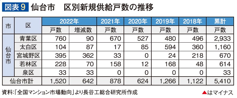 前年より642戸増の1,520戸。1,500戸を超えるのは2007年(1,911戸)以来。市内5区全てで前年を上回る供給が行われ、特に宮城野区では新規発売開始された大規模物件の供給が行われたことで、362戸増の395戸と大幅に増加した。青葉区では90戸増の760戸で仙台市の半数を占めた(図表9)。
