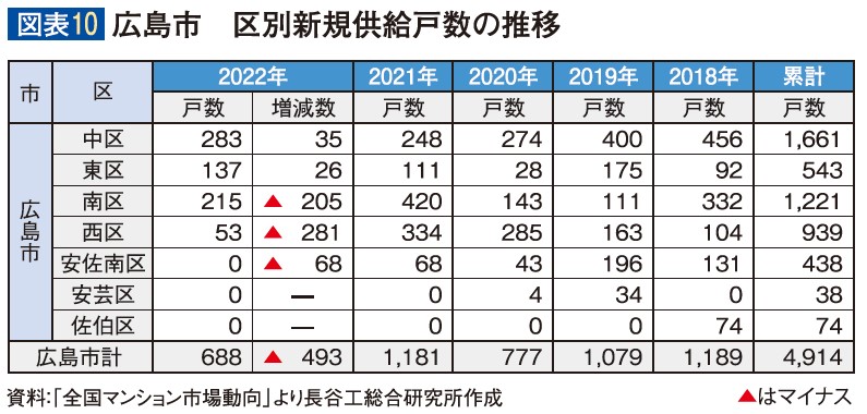 前年より493戸減の688戸の供給にとどまる。中区では35戸増の283戸、東区では26戸増の137戸と前年と同等の水準であったが、2021年に大規模物件が供給された南区は、反動により205戸減の215戸、新規発売開始物件のなかった西区では281戸減の53戸と前年から200戸以上の減少となった。また安佐北区・安芸区・佐伯区では2021年に続き供給が行われなかった(図表10)。
