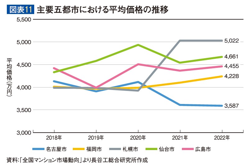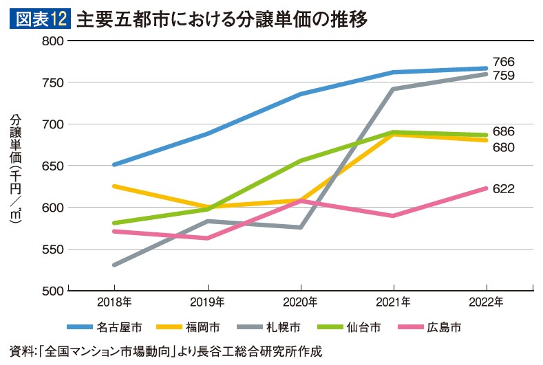 福岡市の平均価格は前年比3.2%アップの4,228万円、分譲単価は同1.0%ダウンの680千円/㎡。札幌市の平均価格は前年比0.1%ダウンの5,022万円、分譲単価は同2.3%アップの759千円/㎡で2021年と同様の高い水準で推移。仙台市は平均価格4,661万円で前年比2.8%アップ、分譲単価は686千円/㎡で同0.6%ダウン。広島市は平均価格4,455万円で同2.1%アップ、分譲単価は622千円/㎡で同5.4%アップだった(図表11・12)。