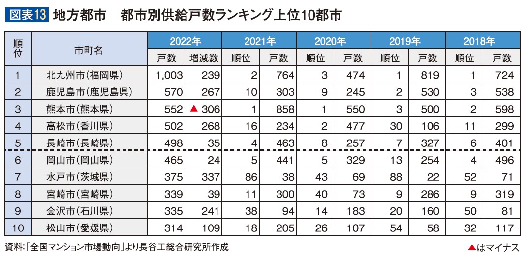2022年(1~12月)の主要五都市を除く都市別供給戸数上位10都市をみると、最も供給戸数の多かった都市は北九州市で前年から239戸増の1,003戸の供給。広島市を上回る戸数が供給された。次いで鹿児島市は267戸増の570戸、熊本市は306戸減の552戸と九州の都市が1~3位となった。また上位6都市は継続的な供給が行われており、近年では頻繁に上位にランクインしている(図表13)。