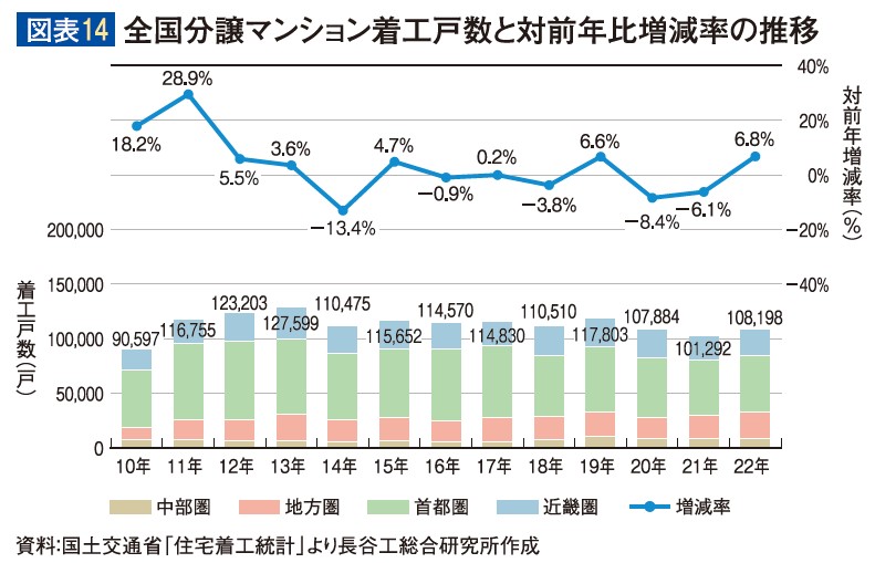 2022年(1~12月)の全国における分譲マンションの着工戸数は、前年比6.8%増の10万8,198戸。3年ぶりに前年を上回ったが、新型コロナウイルス感染症拡大以前(2014年~2019年)の11万戸台の水準には届かなかった(図表14)。
