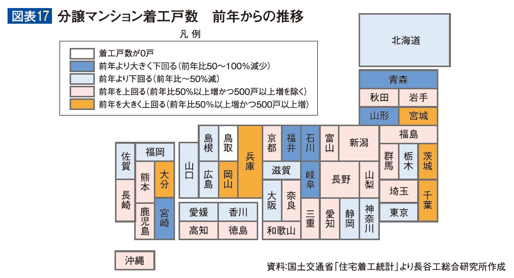 一方前年比50%~100%減と大きく下回った県は、青森県・山形県・石川県・福井県・岐阜県・鳥取県・宮崎県の7県。供給戸数が前年より増加した青森県の着工戸数は同54.5%減の112戸、石川県では同56.1%減の169戸。また鳥取県では着工戸数が0戸だった(図表16・17)。