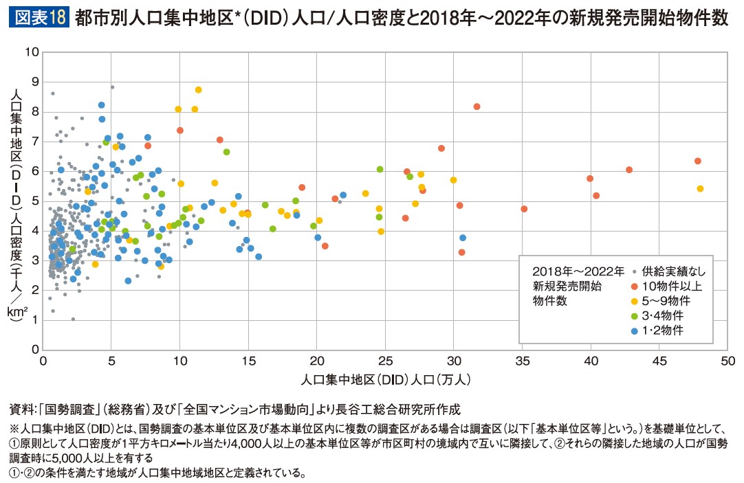 ここまでみてきたような、中部圏・地方圏の主要五都市や供給戸数ランキングの上位に入る都市は、政令指定都市や中核市といったエリアの中心となる大都市であり、物件の供給も継続的に行われてきたと思われる。今回はそれ以外の都市における分譲マンション供給の傾向、新規発売物件が供給される頻度について、人口の集積度合いとの関連性に着目して傾向を調べた。人口の集積度合いについては、2020年国勢調査における市町別の人口集中地区(DID)の人口・人口密度を、新規物件発売の頻度については2018年~2022年の㈱不動産経済研究所「全国マンション市場動向」に掲載されている物件のうち、新規発売開始された物件数を長谷工総合研究所にて集計して使用している(図表18)。