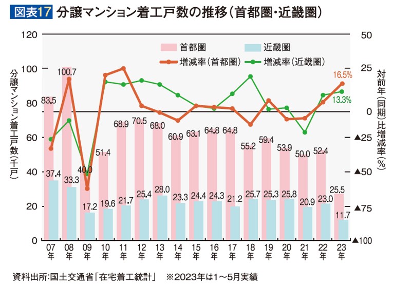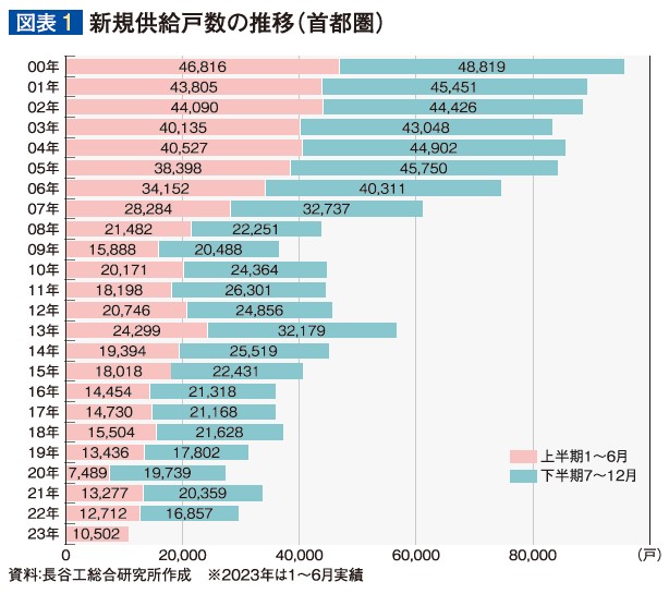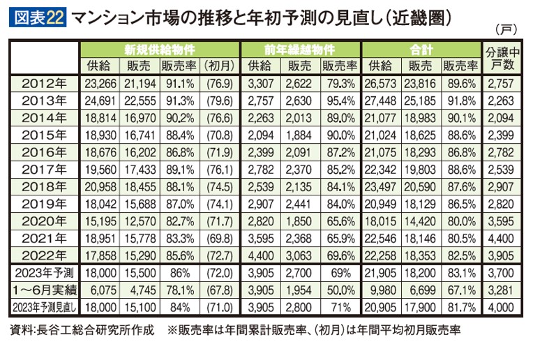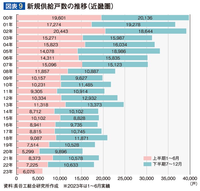 2023年下半期の供給能力を考えるうえで、2022年の着工戸数から既に供給された戸数を除くと、首都圏では約4万3,000戸程度、近畿圏では約1万7,000戸程度の規模となる。