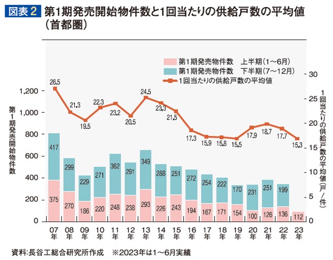 第1期発売開始物件の供給状況をみると、2023年上半期は112件5,610戸で、前年同期(136件7,443戸)を件数、戸数共に下回っている。1回当たりの供給規模別の供給状況では、10戸未満にとどまった物件は687件中387件、構成比は56.3%。構成比は前年同期(783件中443件、構成比56.6%)並みの小規模供給が中心。また、1回当たりの供給戸数の平均値は15.3戸/件で、前年同期(16.2戸/件)を下回った。新規供給戸数が前年同期を下回ったのは、新規供給件数が前年同期を下回ったのに加え、1回当たりの供給戸数の小規模化が進んだ影響である(図表2)。
