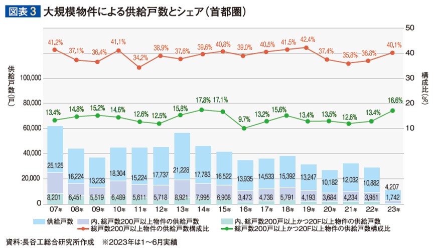 総戸数200戸以上の大規模物件の供給状況をみると、大規模物件による供給戸数は4,207戸で、前年同期(5,049)戸を下回ったが、新規供給戸数全体に占める構成比では40.1%で、前年同期(39.7%)を上回った。また、総戸数200戸以上かつ20階以上の超高層物件による供給戸数は1,742戸で、前年同期(2,097戸)を下回ったが、新規供給戸数全体に占める構成比は16.6%で前年同期(16.5%)並みとなった。