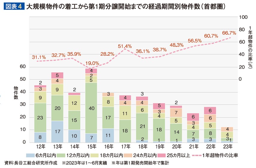 尚、超高層を含む総戸数200戸以上の大規模物件については、着工から第1期発売開始までの期間が1年超となる物件の比率が上がってきている。2022年に回復した分譲マンションの着工戸数ではあるが、市場を牽引する新たな大規模物件の発売開始は、2023年下半期以降多くなることが見込まれる(図表3・4)。