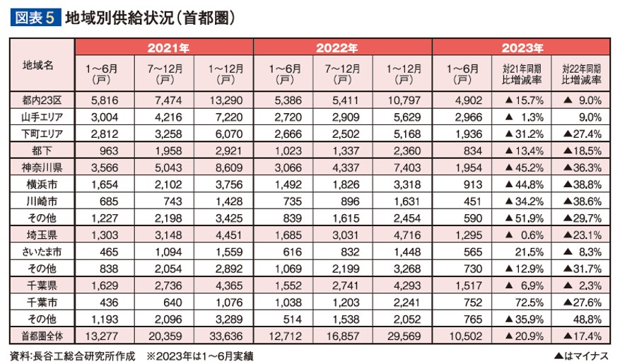 2023年上半期の地域別供給状況をみると、前年同期を上回ったのは、都内23区山手エリア、その他千葉のみ。都内23区下町エリア、横浜市、川崎市、その他神奈川、さいたま市、その他埼玉、千葉市は前年同期を下回った(図表5)。