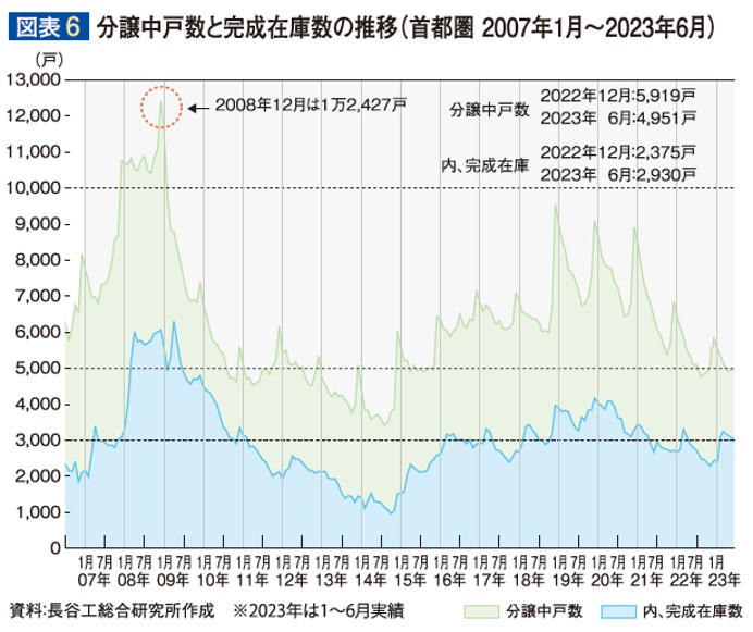 在庫物件の販売も順調に推移しており、6月末の分譲中戸数は4,951戸と、前年末(5,919戸)から968戸減少している。完成在庫は3月末に3,219戸と3,000戸を上回っていたが、4月以降は減少に転じ、6月末では2,930戸に減少している(図表6)。