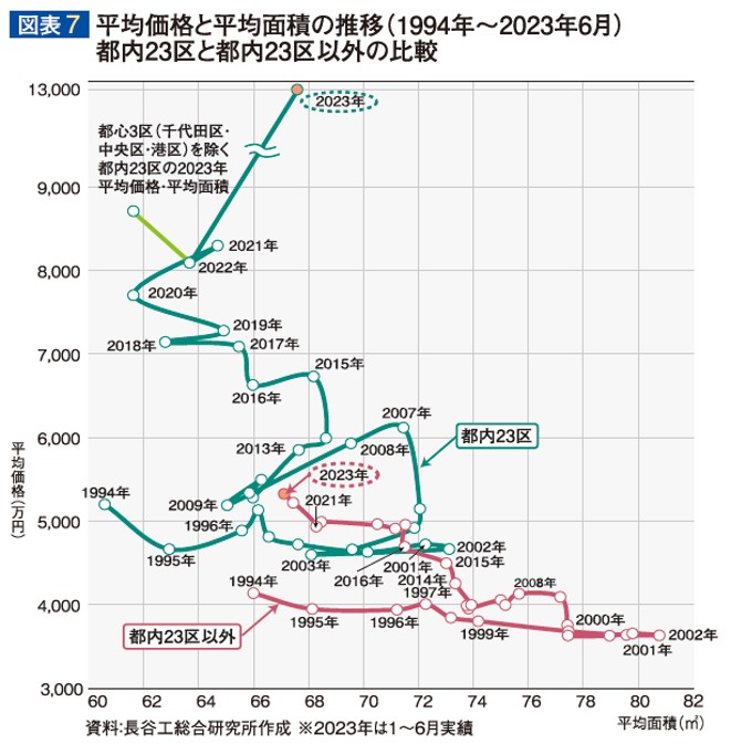 地域別の供給商品内容をみると、都内23区の分譲単価は1,924千円/㎡(前年比49.4%アップ)、平均面積は67.38㎡(同5.3%アップ)、平均価格は1億2,962万円(同57.4%)。23区山手エリアによる突出した上昇の影響であり、都心3区(千代田区・中央区・港区)を除いた23区の分譲単価は前年比13.2%アップの1,417千円/㎡、平均面積は同0.8%縮小の61.51㎡、平均価格は同12.2%アップの8,716万円。
