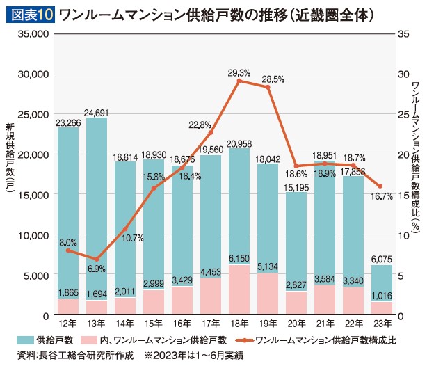 うちワンルームマンションは10件1,016戸と前年同期(18件1,598戸)を下回った。2020年以降、ワンルームマンションの供給は低調であったが、その傾向が強まった。また、ワンルームマンションを除いたファミリー向け住戸も5,059戸と前年同期(5,627戸)を下回った(図表10)。