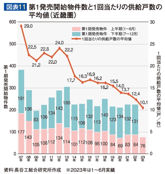 また、第1期発売開始物件も76物件3,730戸と、物件数、戸数共に前年同期(84物件4,238戸)を下回った。新規供給戸数が前年同期を下回ったのは、新規供給件数が前年同期を下回ったのに加え、1回当たりの供給戸数の小規模化が進んだ影響である(図表11)。