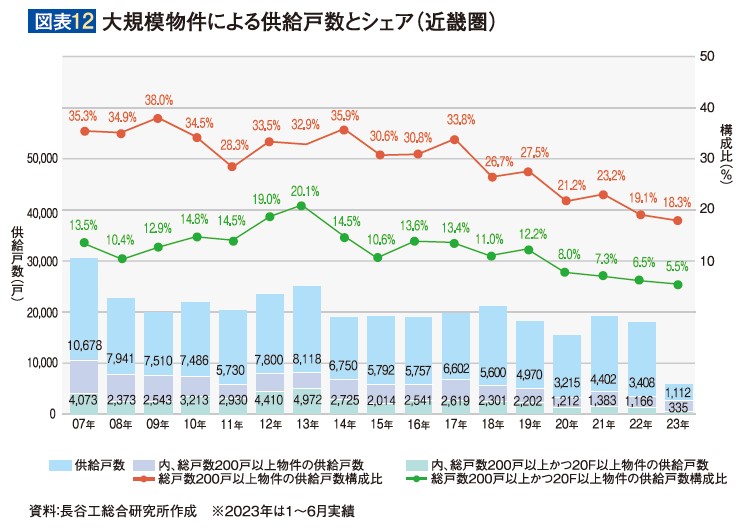 総戸数200戸以上の大規模物件の供給状況をみると、大規模物件による供給戸数は1,112戸で、新規供給戸数全体に占める構成比は18.3%と、戸数・構成比共に前年同期(1,686戸・23.3%)を下回っている。また、総戸数200戸以上かつ20階以上の超高層物件による供給戸数は335戸で、前年同期(500戸)を下回り、新規供給戸数全体に占める構成比でも5.5%と、前年同期(6.9%)を下回った(図表12)。