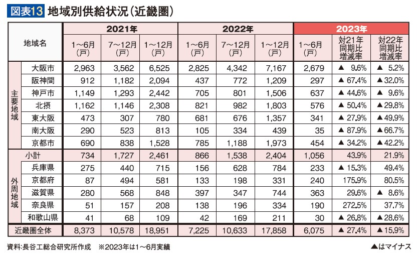 2023年上半期の地域別供給戸数をみると、主要地域は前年同期を大きく下回り、大阪市でも前年同期比5.2%減となった(図表13)。